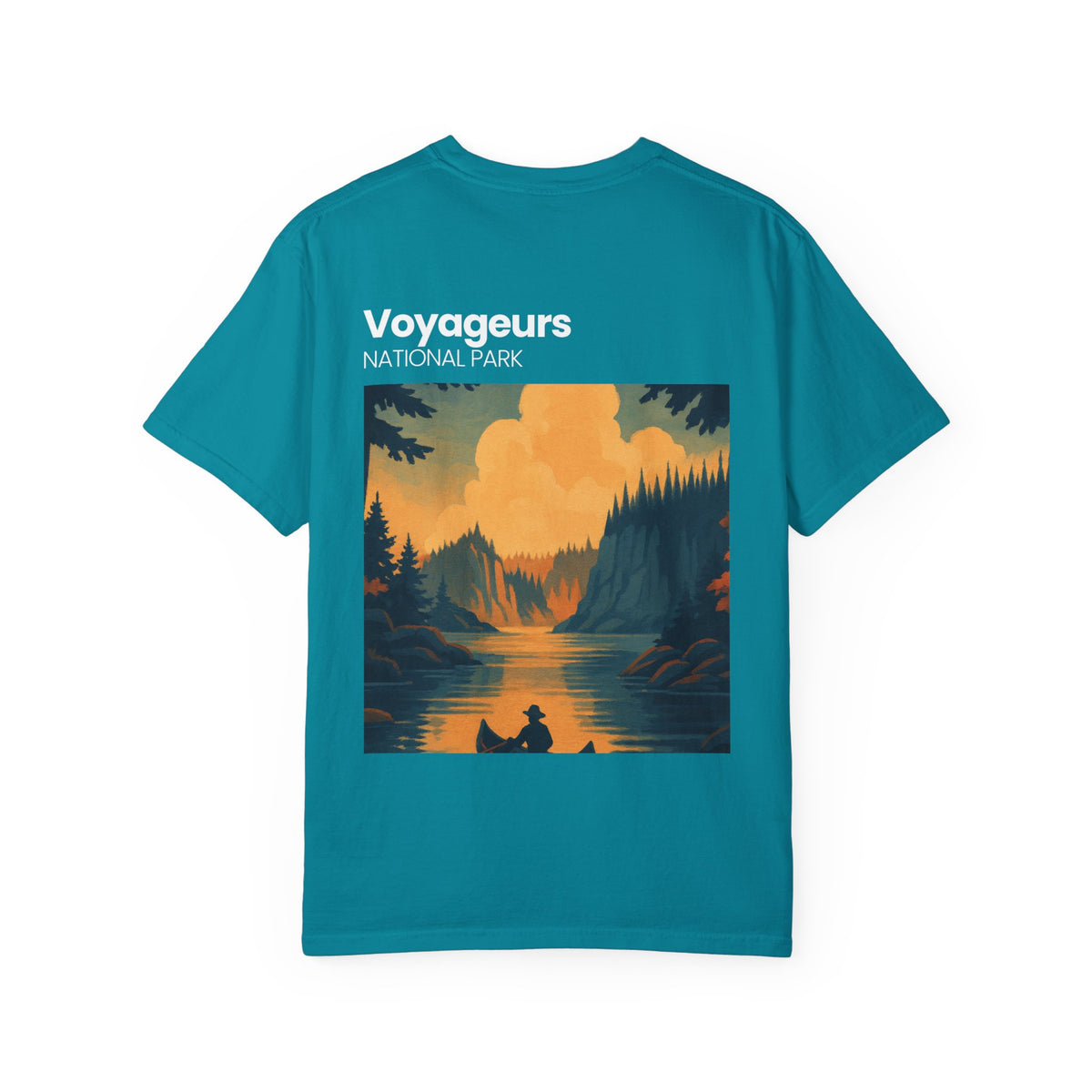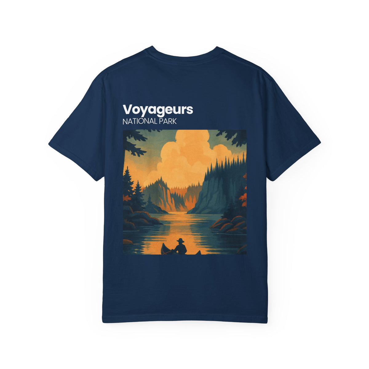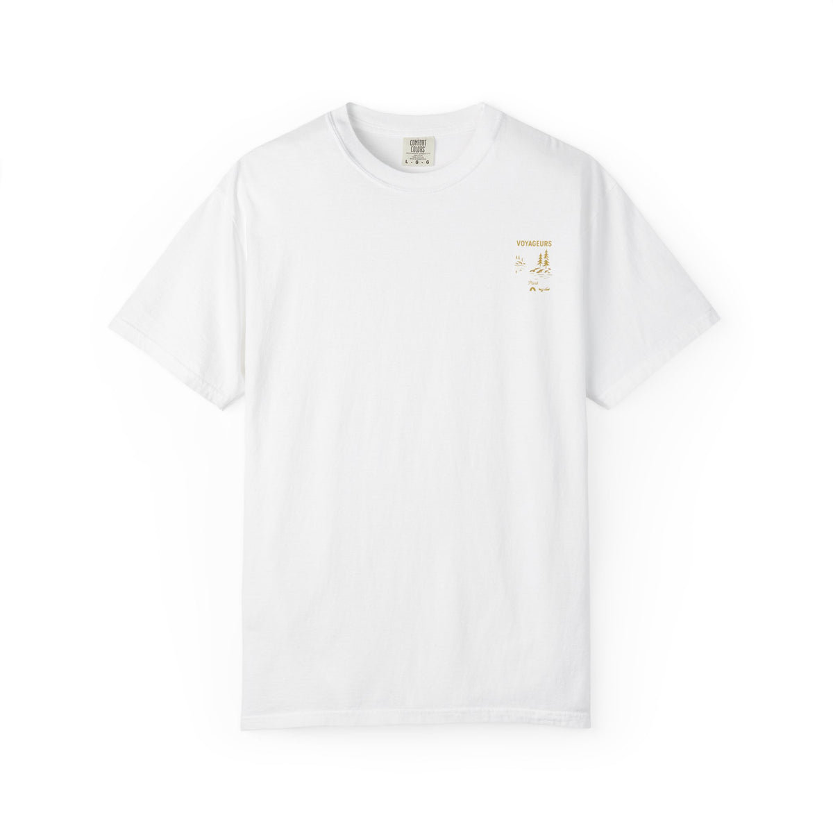This soft, garment-dyed tee brings mornings on the lake to your everyday wardrobe. The relaxed fit and medium-weight 100% ring-spun cotton drape easily over layers, while the faded, post-dye finish gives each shirt a lived-in feel—like the shirt you reach for after a long day outdoors. The back features a retro national-park–style illustration of a canoe at sunset, framed by pine silhouettes and warm skies. It sits quietly confident in casual outfits: paired with worn denim, a flannel tied at the waist, or under a light jacket for cool evenings. Wear it on trail-to-town days, slow weekend paddles, or small gatherings where stories start around a shared view of the water.