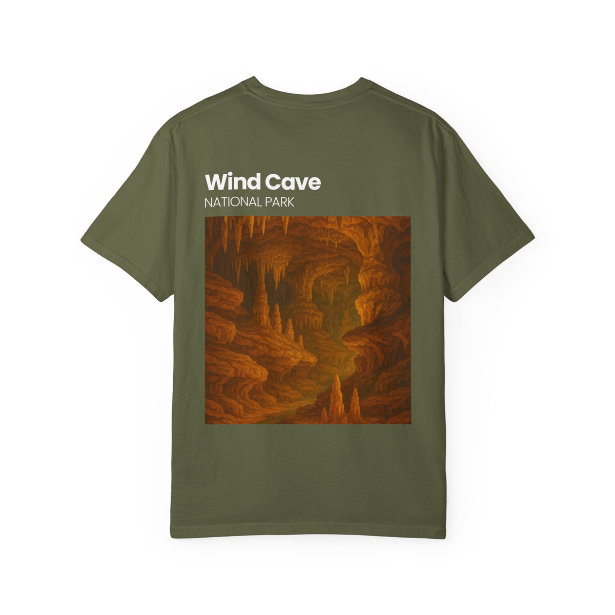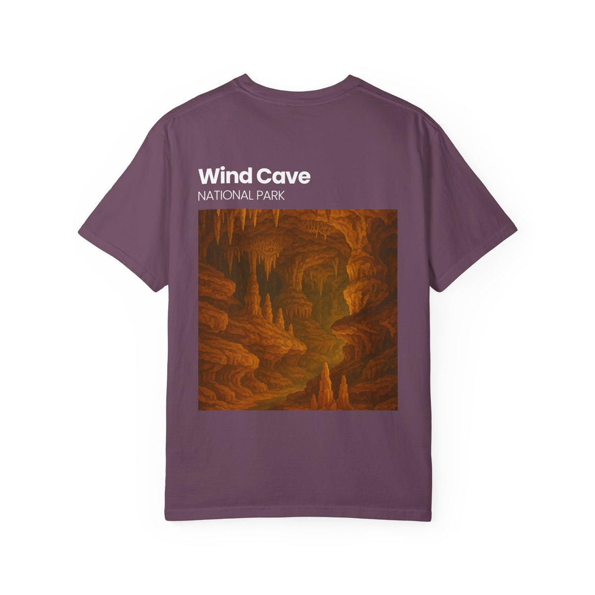 This relaxed-fit garment-dyed tee brings quiet, adventurous energy to everyday wear. A small chest emblem and a large back print showcase a warm, painterly cave scene labeled “Wind Cave — National Park,” evoking slow walks through dripped stone and amber light. The soft, garment-dyed cotton settles into the body for lived-in comfort that layers well under jackets or stands alone on warm days. Wear it on trail days, road trips to public lands, or when you want a reminder of subterranean stillness and the long patience of rock.