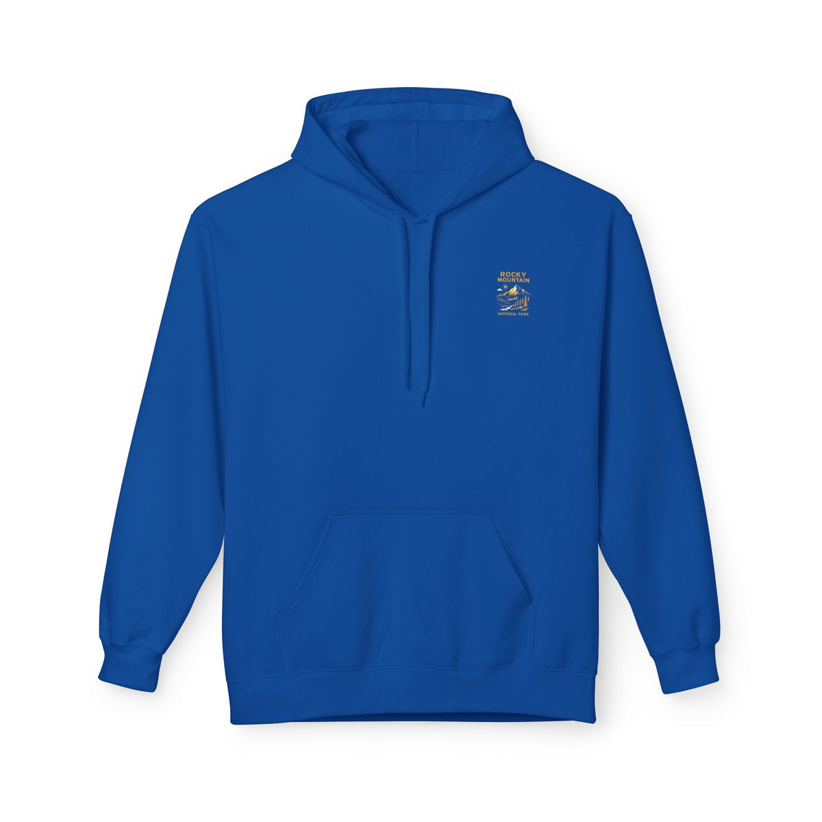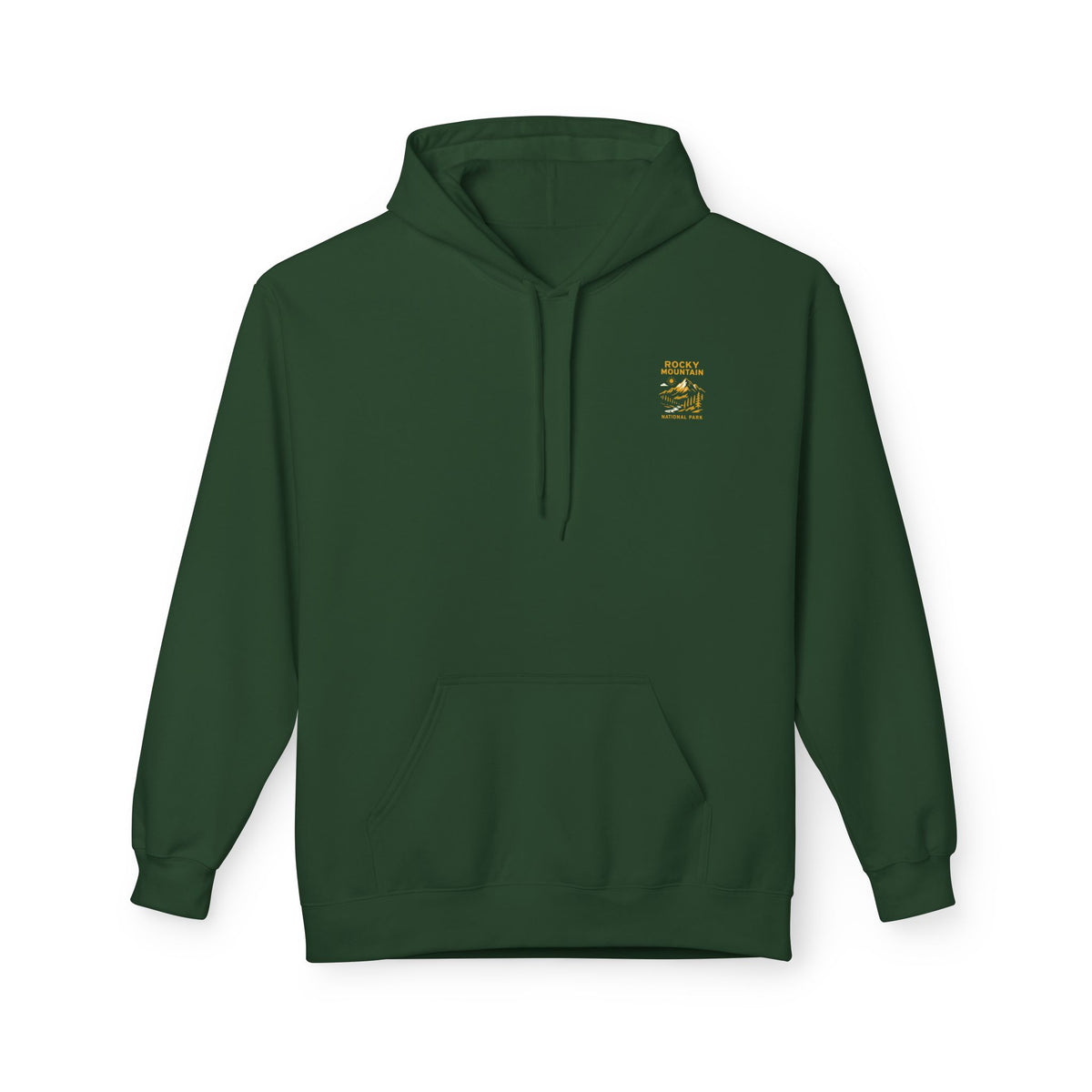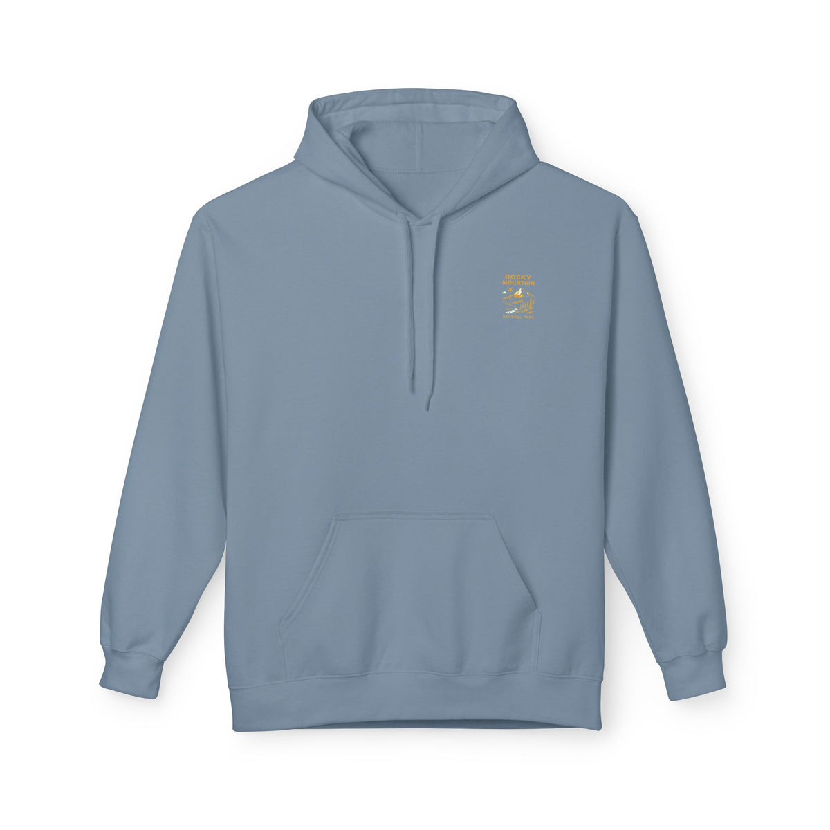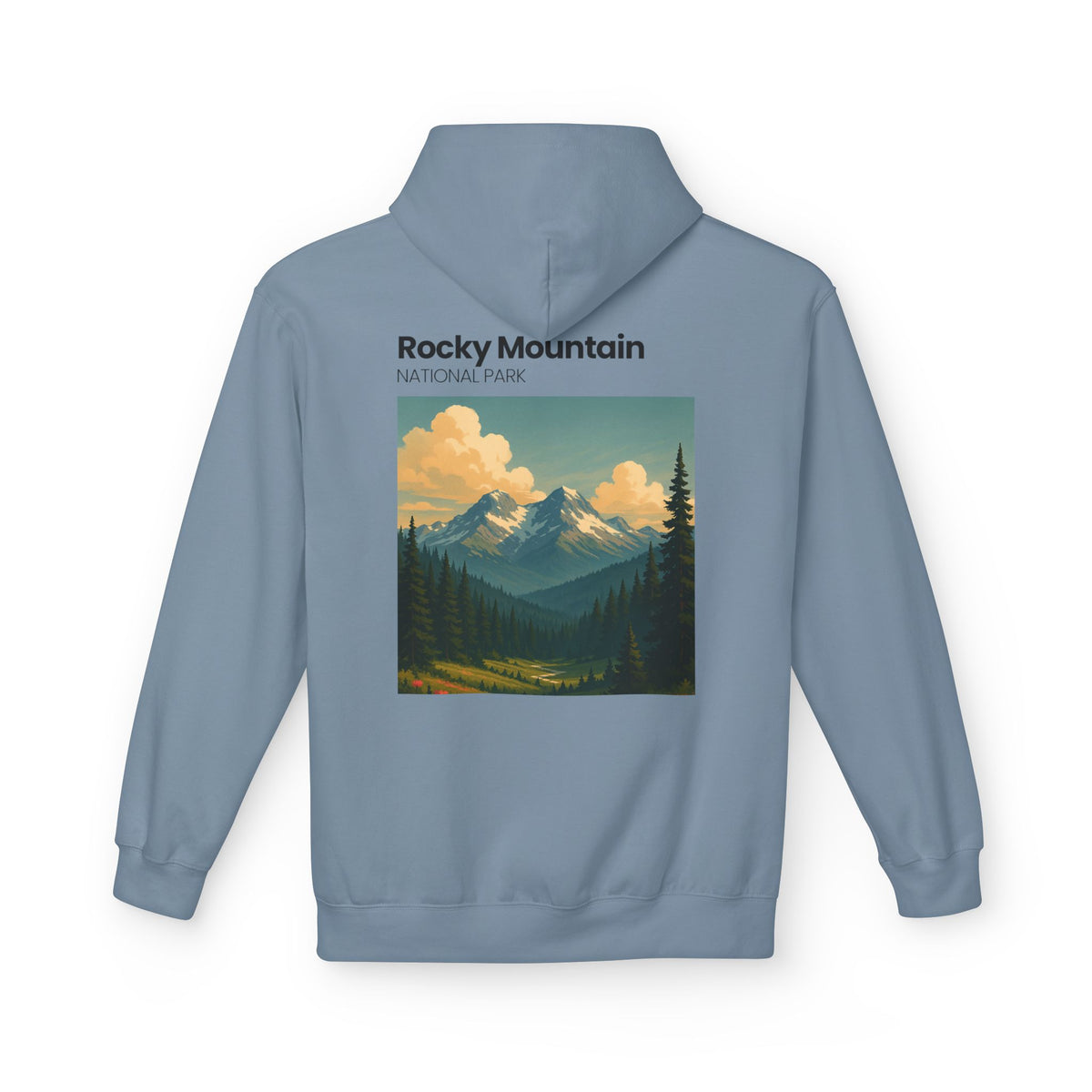A cozy midweight hoodie that brings the Rockies to your everyday rhythm. The front carries a small, subtle tag-style print, while the back opens into a vintage-inspired Rocky Mountain landscape—soft, painterly peaks, warm golden clouds and tall pines that feel like a late-afternoon trailhead. The dropped shoulders and relaxed, classic fit let the hoodie layer easily over tees or base layers. It’s substantial without being bulky: a medium-heavy fabric that holds shape and color, with a two-piece jersey-lined hood for extra warmth and a kangaroo pouch to warm hands or stash essentials. Ethically made and OEKO-TEX certified, this piece blends responsible production with quiet, outdoorsy style you’ll reach for on cool mornings, post-hike meetups, or slow weekends at a cabin.