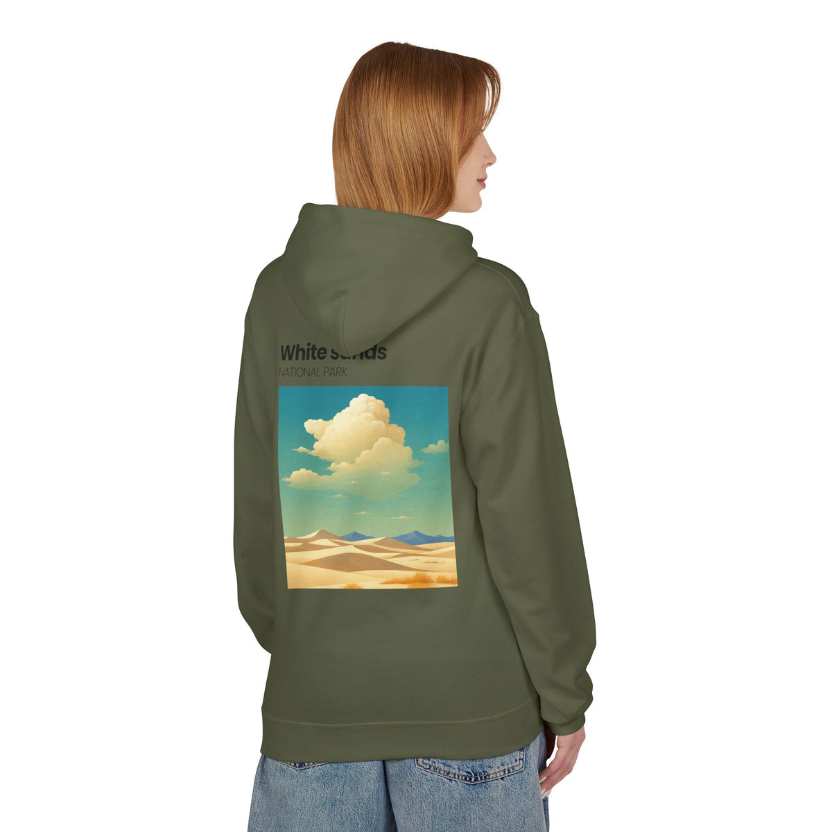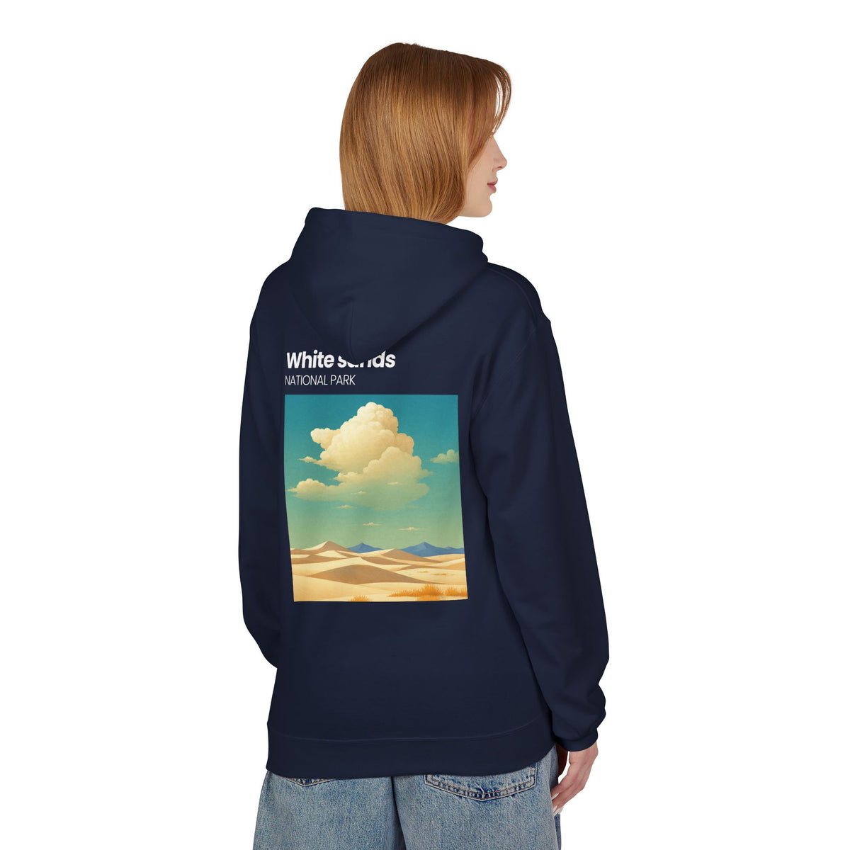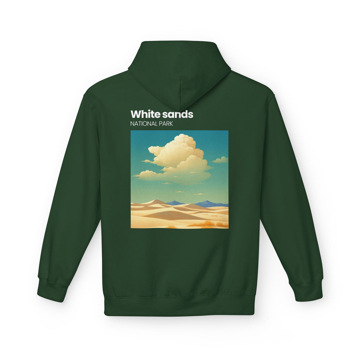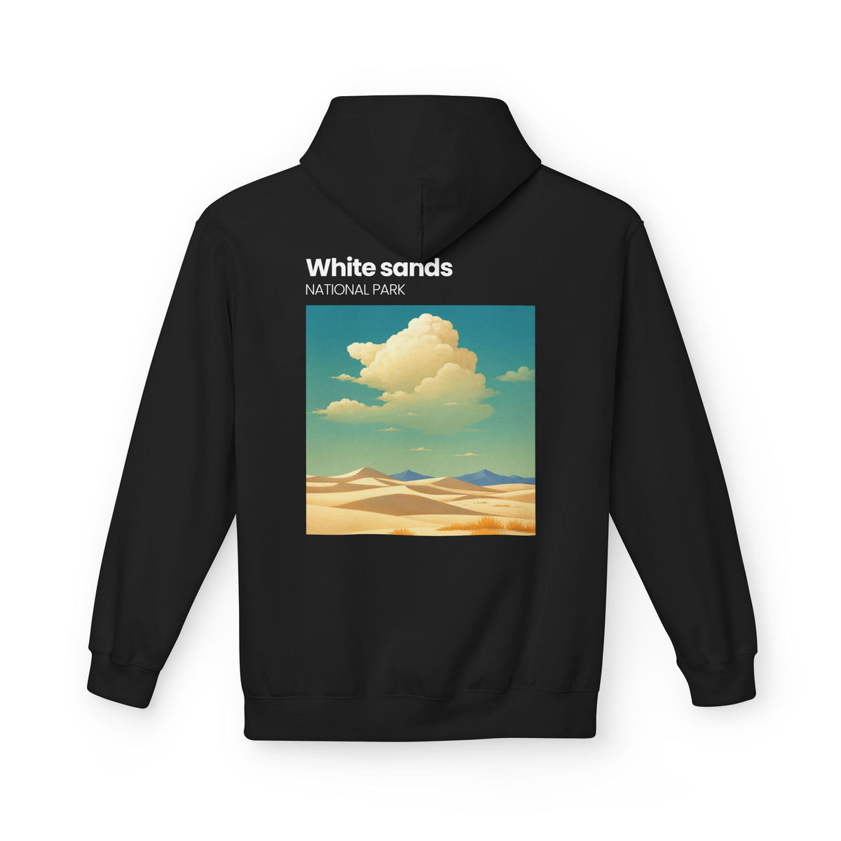 A soft, midweight hoodie inspired by wide-open desert light and vintage park posters. The front wears a small, embroidered-style patch near the chest while the back carries a sun-washed illustration of dunes and drifting clouds labeled “White sands NATIONAL PARK.” It sits comfortably over layers with dropped shoulders and a roomy pouch pocket for hands or essentials. The brushed interior and two-piece lined hood feel warm without bulk — the kind of hoodie you reach for on chilly morning drives, slow hikes across sandy ridges, or evenings around a fire. Thoughtful manufacturing details — OEKO-TEX certification and FLA/WRAP partnerships — mean you’re choosing something made with environmental and labor considerations in mind.