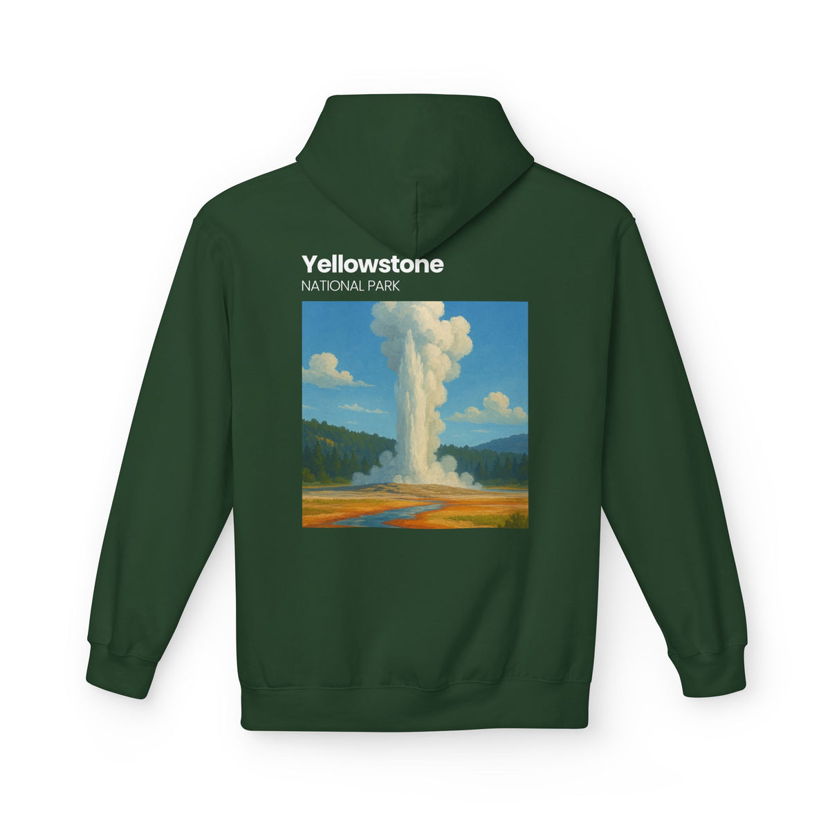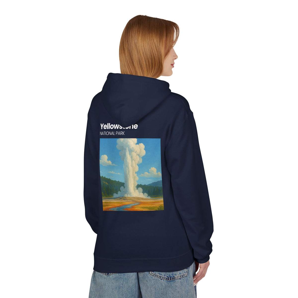 Soft, substantial, and quietly adventurous — this midweight fleece hoodie carries the wide-open calm of a national park into everyday wear. The front shows a small, detailed emblem over the heart, while the back presents a painterly geyser scene framed with understated 'Yellowstone National Park' text. Wear it on chilly mornings after a campground coffee, layered for trailside pauses, or at home when you want a little landscape to lean into. The dropped shoulders and roomy pouch pocket make movement easy, and the 2-piece lined hood keeps your neck warm without bulk. Sustainably made and responsibly produced, it feels thoughtful from the inside out.