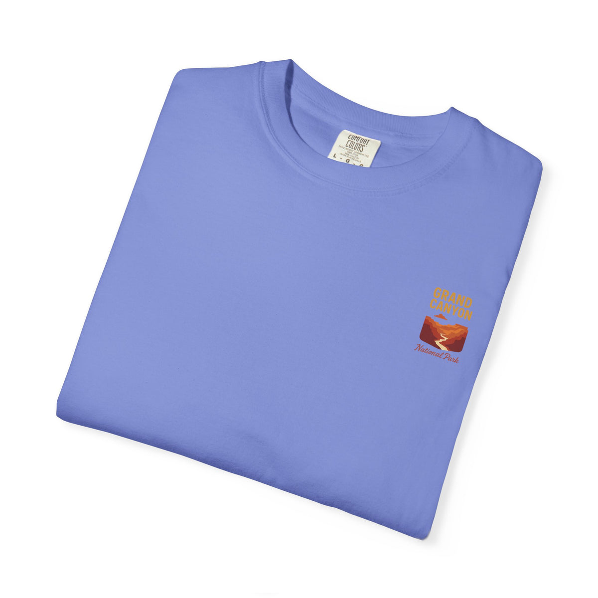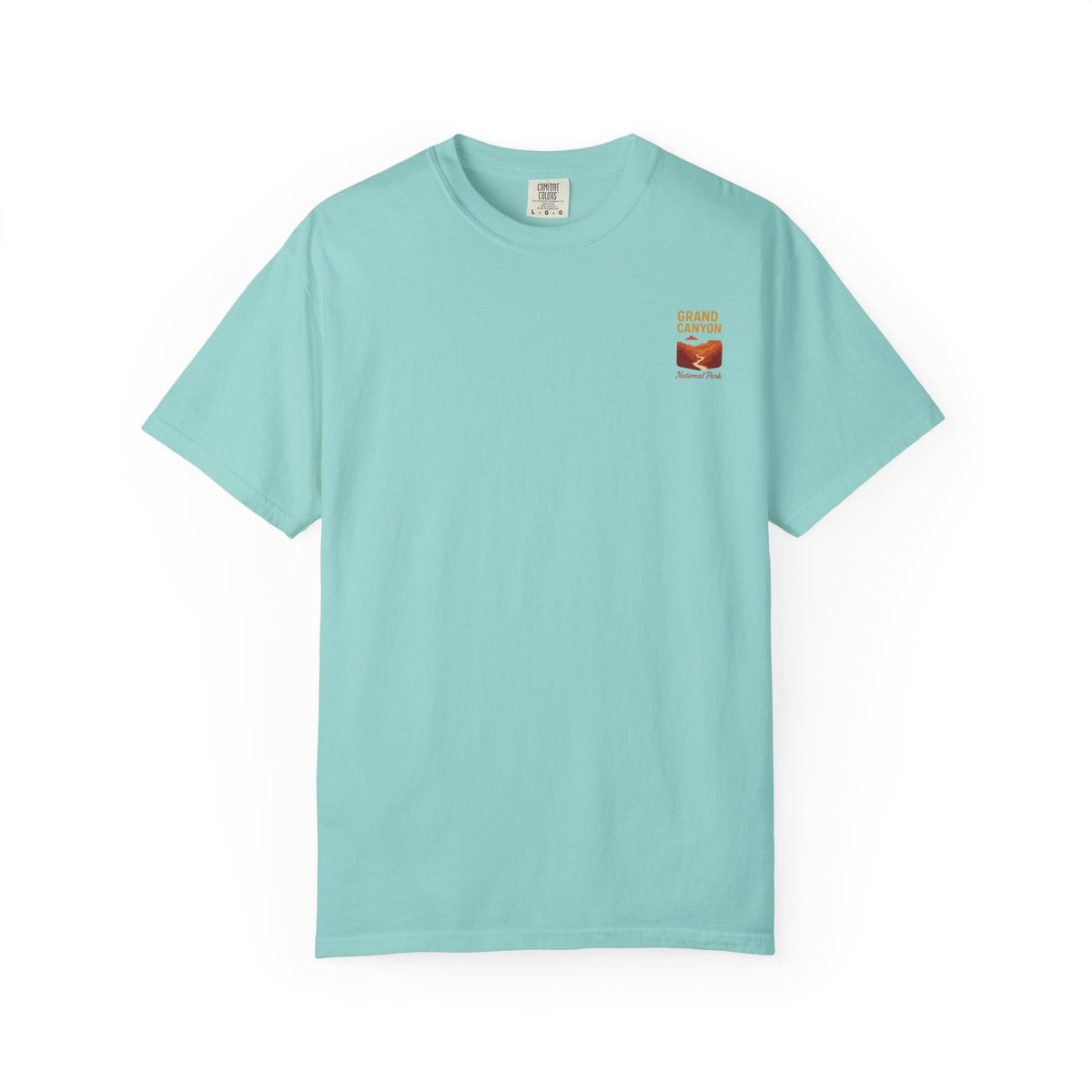 This garment-dyed tee carries a quiet, sunlit nostalgia — a worn-in canvas for a vintage-inspired Grand Canyon print. The soft, slightly faded color and relaxed silhouette make it a shirt that settles into your rotation fast. Wear it on slow drives, campsite mornings, or museum afternoons and feel like you’re carrying a postcard from a canyon rim. The front chest features a small patch-style graphic, while the back shows a bold, painterly landscape and clean “Grand Canyon National Park” text. It’s breathable, sturdy, and comfortably relaxed so you can move through trailheads, coffee lines, or road-trip stops without fuss.