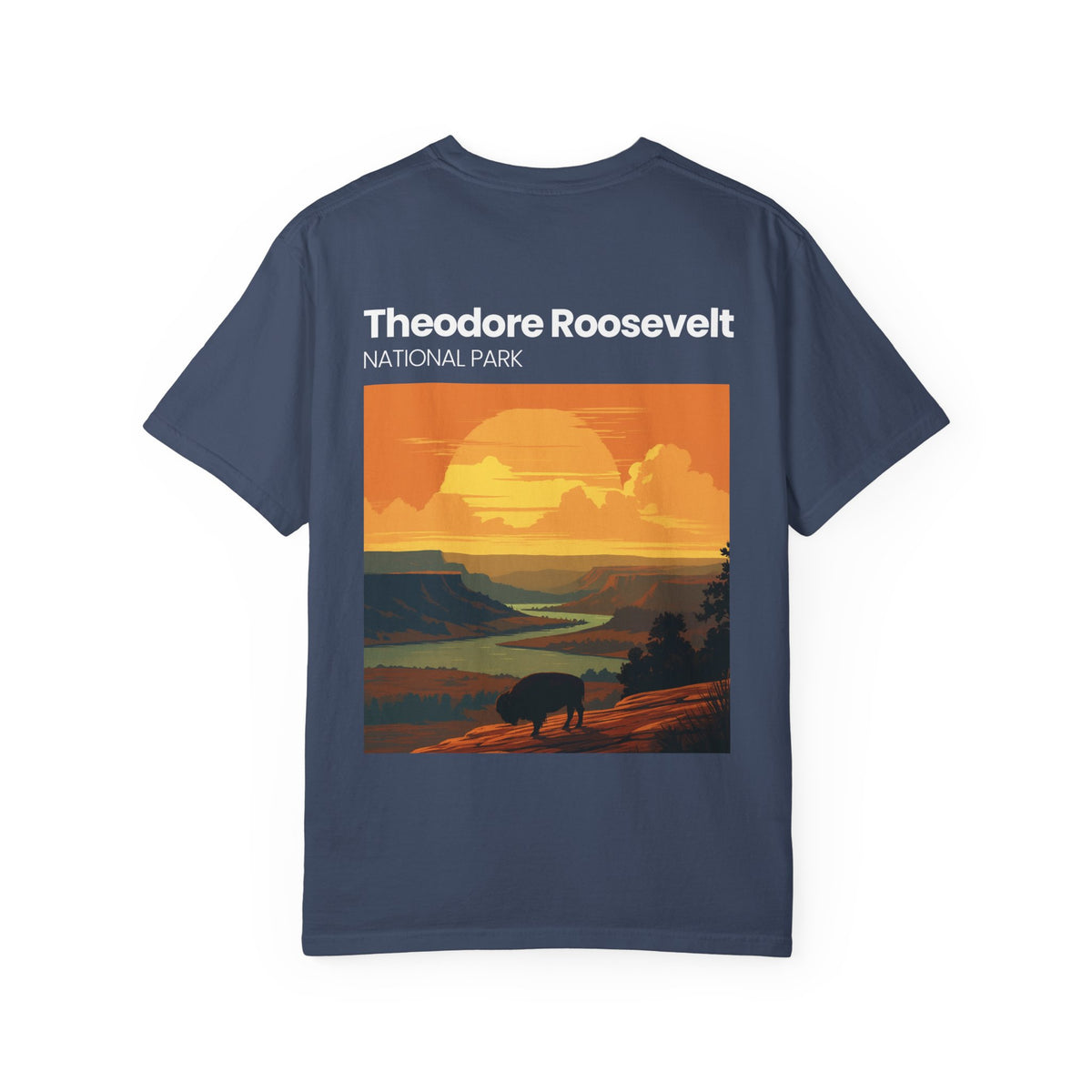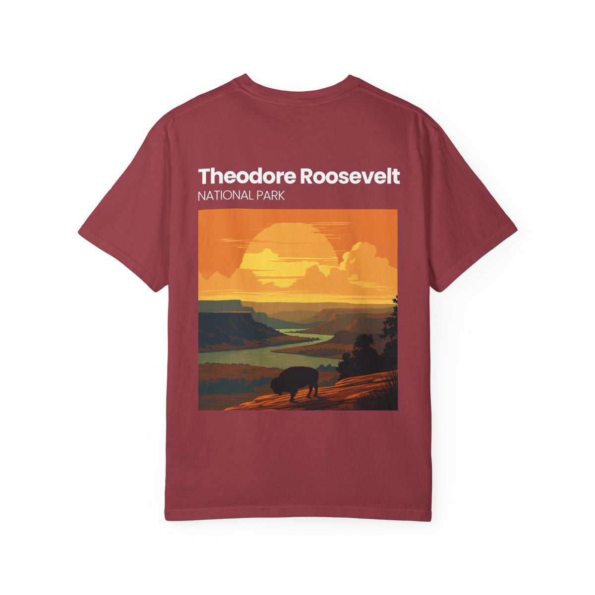 This garment-dyed tee carries the hush of wide-open plains and the slow, golden hours of sunset. Lightweight but sturdy, it settles softly across the shoulders and wears in with character after every wash. The front keeps a quiet nod—a small botanical mark—while the back opens into a sweeping vintage-style park illustration that feels like a memory of evening light and roaming bison. It’s the kind of shirt you grab for weekend trail drives, lodge porches, or layering under a flannel for cool mornings. Breathable cotton, relaxed drape, and muted dyed color give it an effortless, lived-in look that belongs on road maps and scenic detours.