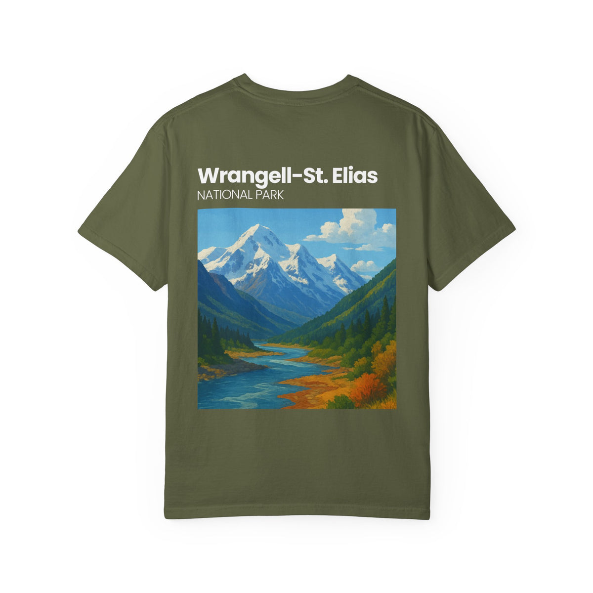 Soft, lived-in tee with a vintage park-poster vibe. The garment-dyed, 100% ring-spun cotton has a broken-in hand that sits comfortably through hikes, camp mornings, and long drives to trailheads. A small chest emblem and a bold, painterly landscape on the back call to wide rivers, glacial peaks, and the quiet of Wrangell–St. Elias. Wear it layered under a flannel or on its own—the relaxed fit and medium-weight fabric move with you without feeling heavy. This T-shirt reads like a well-traveled keepsake: familiar, rugged, and quietly scenic.