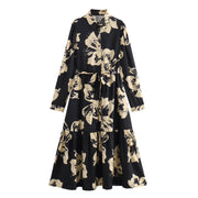 Long Sleeve Printed Temperament Waist-controlled Breasted Shirt Dress