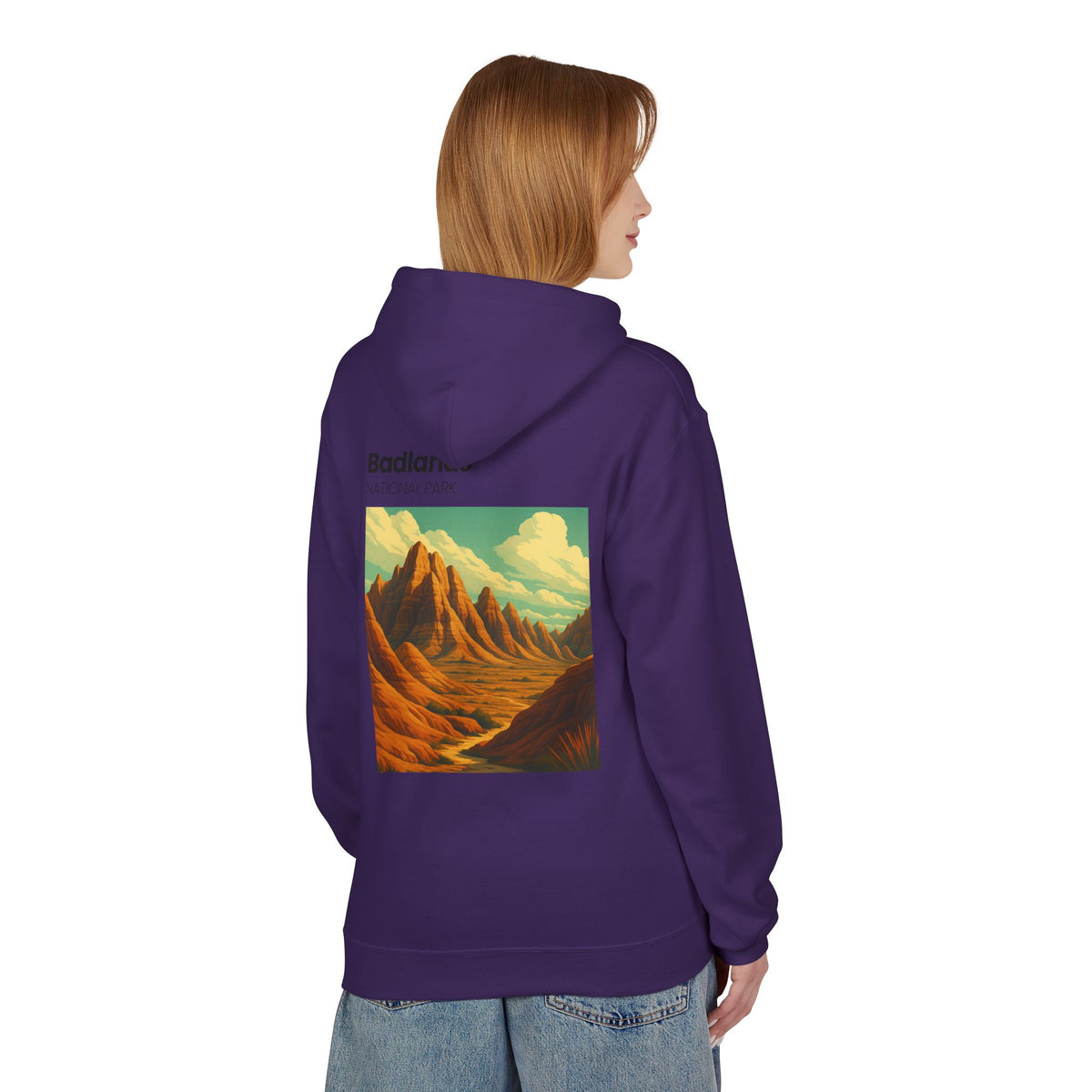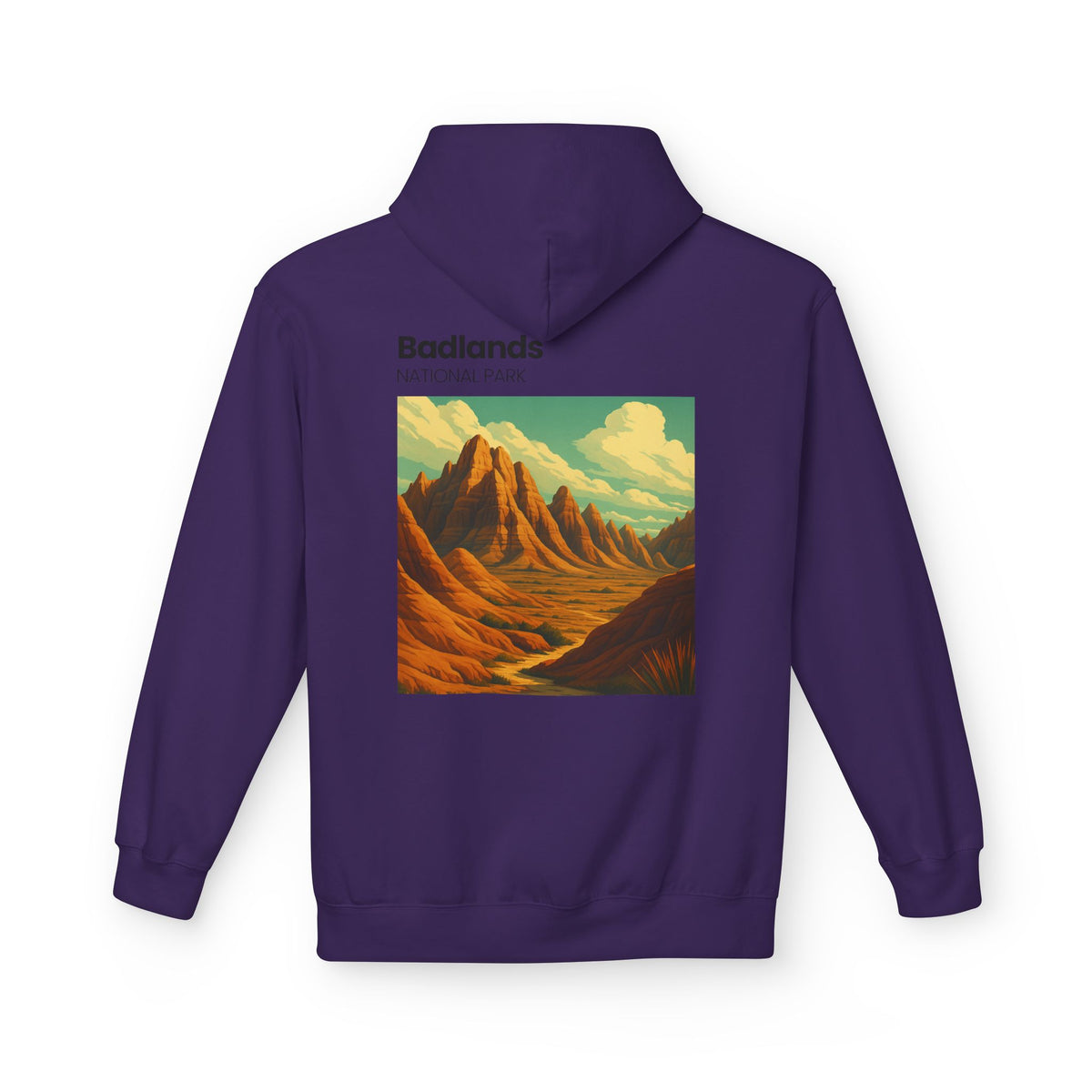 A midweight fleece hoodie that feels like a quiet morning hike through red rock canyons. The back features a vintage-style Badlands landscape print in warm ochres and sage, while a small companion emblem sits over the heart. It wears relaxed with dropped shoulders and a roomy pouch pocket for gloves, snacks, or a phone. The two-piece jersey-lined hood adds an extra layer of warmth when wind picks up on the ridge. Built from a soft ring-spun cotton blend with thoughtful, certified manufacturing — this hoodie brings a subtle outdoor aesthetic into everyday life.
