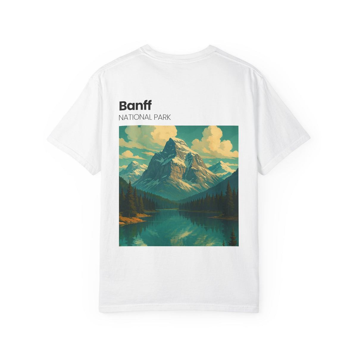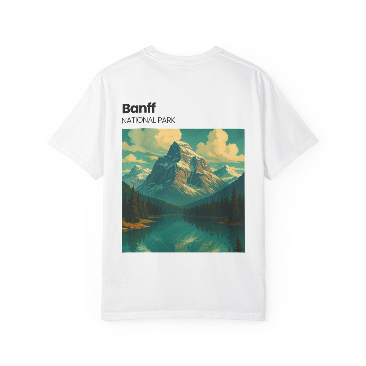 Soft, worn-in cotton that carries the cool hush of pine and mountain air. This relaxed, garment-dyed tee features a vintage-style Banff National Park print on the back and a small, faded chest motif — like a postcard you can wear. The medium-weight fabric and garment-dye process give it a lived-in hand and muted color that ages beautifully. Wear it on crisp mornings, at trailheads, or curled up with a map and a hot mug. It sits loose over jeans or under a flannel, adding an effortless outdoorsy layer to weekend plans and travel days.