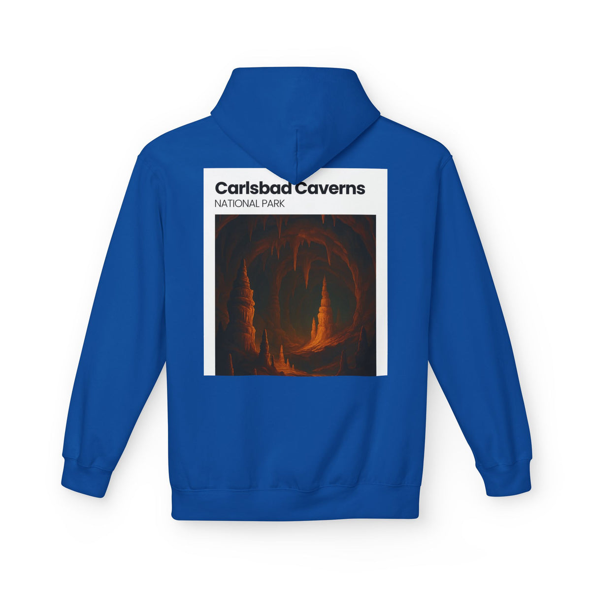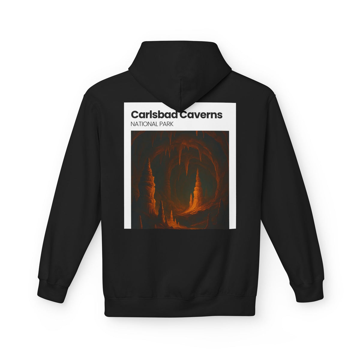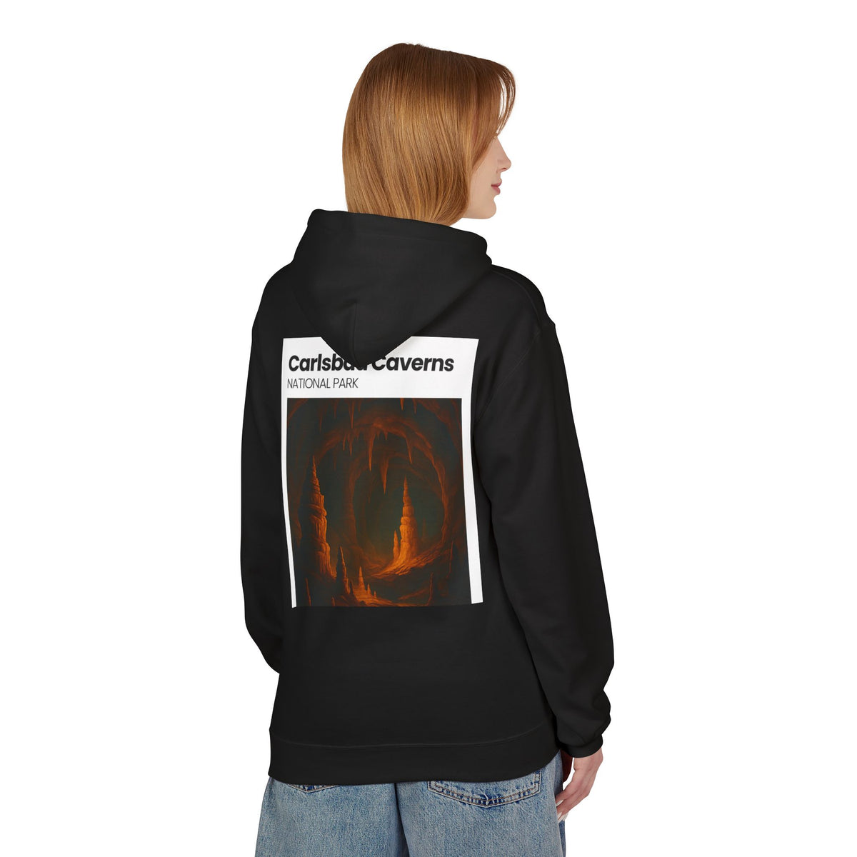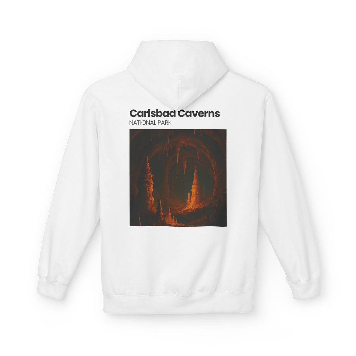 This midweight fleece hoodie channels quiet wonder — a clean white canvas with a small, vintage-inspired chest emblem and a dramatic back print that evokes the warm glow of cavern interiors. It sits relaxed on the shoulders with a dropped silhouette, a double-layer jersey hood for extra warmth, and a roomy pouch pocket to warm hands or hold essentials. The medium-heavy fabric feels substantial without being bulky, and sustainably produced materials and certified manufacturing make it a thoughtful, responsibly made wardrobe piece. Wear it on cool evenings after a hike, at campfire gatherings, or while planning your next national park trip — it settles into everyday life while carrying a sense of place.