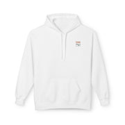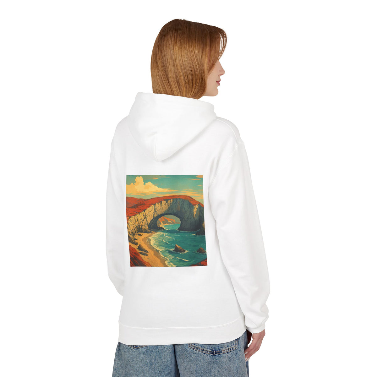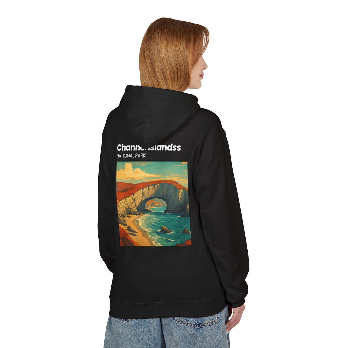 This midweight fleece hoodie carries a quiet, coastal energy — a wearable postcard from the Channel Islands. The front features a small, vintage-style logo over the heart, while the back opens up with a bold, painterly landscape in warm sunset tones: windswept cliffs, a natural stone arch, and the surf below. The fleece weight gives it a structured yet lived-in feel, and the dropped shoulders and pouch pocket make it comfortable for long walks on the beach or cool evenings around a fire. Thoughtfully made with OEKO-TEX and socially-conscious manufacturing partners, it blends retro park-poster style with modern, responsible production.