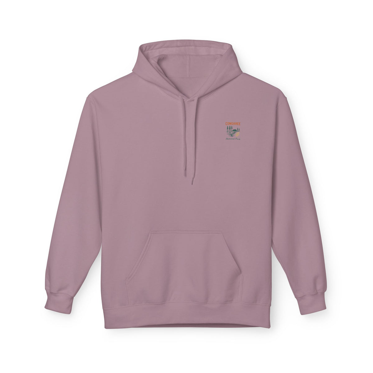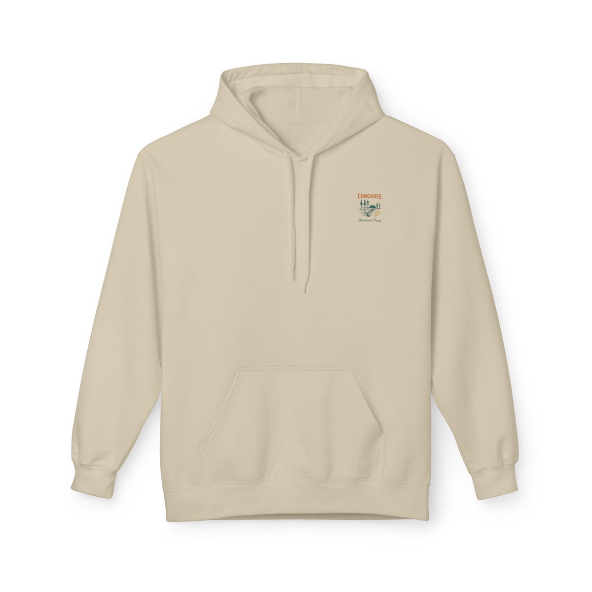 Lightweight warmth with the hush of old-growth forest. This fleece hoodie features a soft, medium-heavy knit and a relaxed, dropped-shoulder cut that reads like a slow walk beneath cathedral pines. The front shows a small, subtle emblem while the back opens into a rich, painterly landscape of Congaree National Park — deep greens, misted light, and towering trunks. It layers easily over tees on cool mornings, holds your hands in the roomy pouch pocket, and feels lived-in from the first wear. Ethically made and OEKO-TEX certified, it carries quiet values along with comfort — a wearable reminder of long trails, canoe strokes, and mornings where the world is mostly green light and hush.