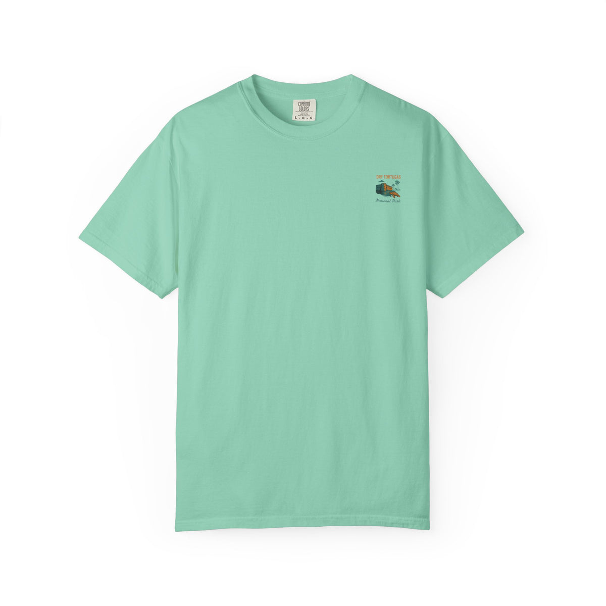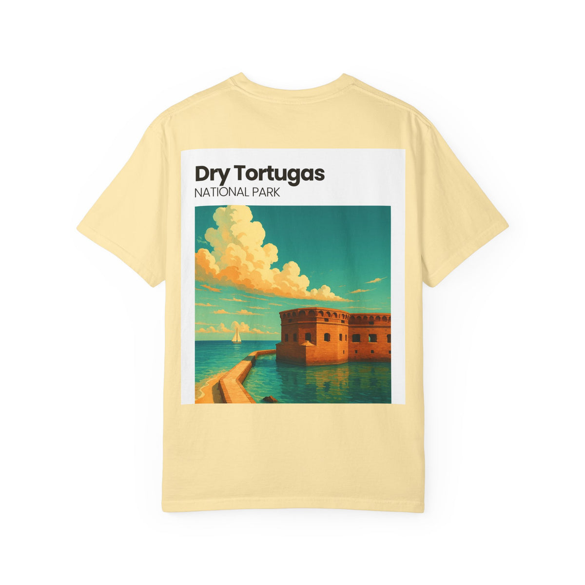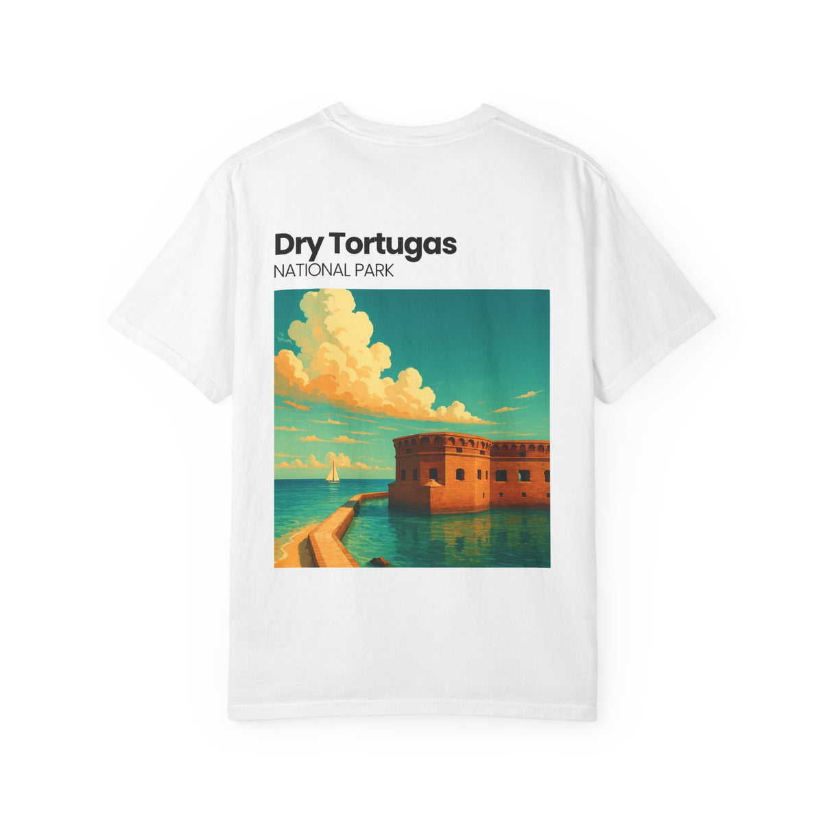 Soft, lived-in cotton with a vintage travel-poster print — this garment-dyed tee feels like a sun-warmed souvenir from the keys. The front keeps it subtle with a small chest emblem, while the back opens up into a painterly depiction of Dry Tortugas: turquoise water, golden fort walls, and a sky thick with late-afternoon clouds. Wear it when you want to carry a little coastal quiet with you: tucked into denim after an early-morning ferry, layered under a shacket at dusk, or folded into a beach bag for an impromptu escape. The relaxed silhouette and slightly faded color make it effortless to style; it’s for people who prefer comfort that looks collected, not contrived.