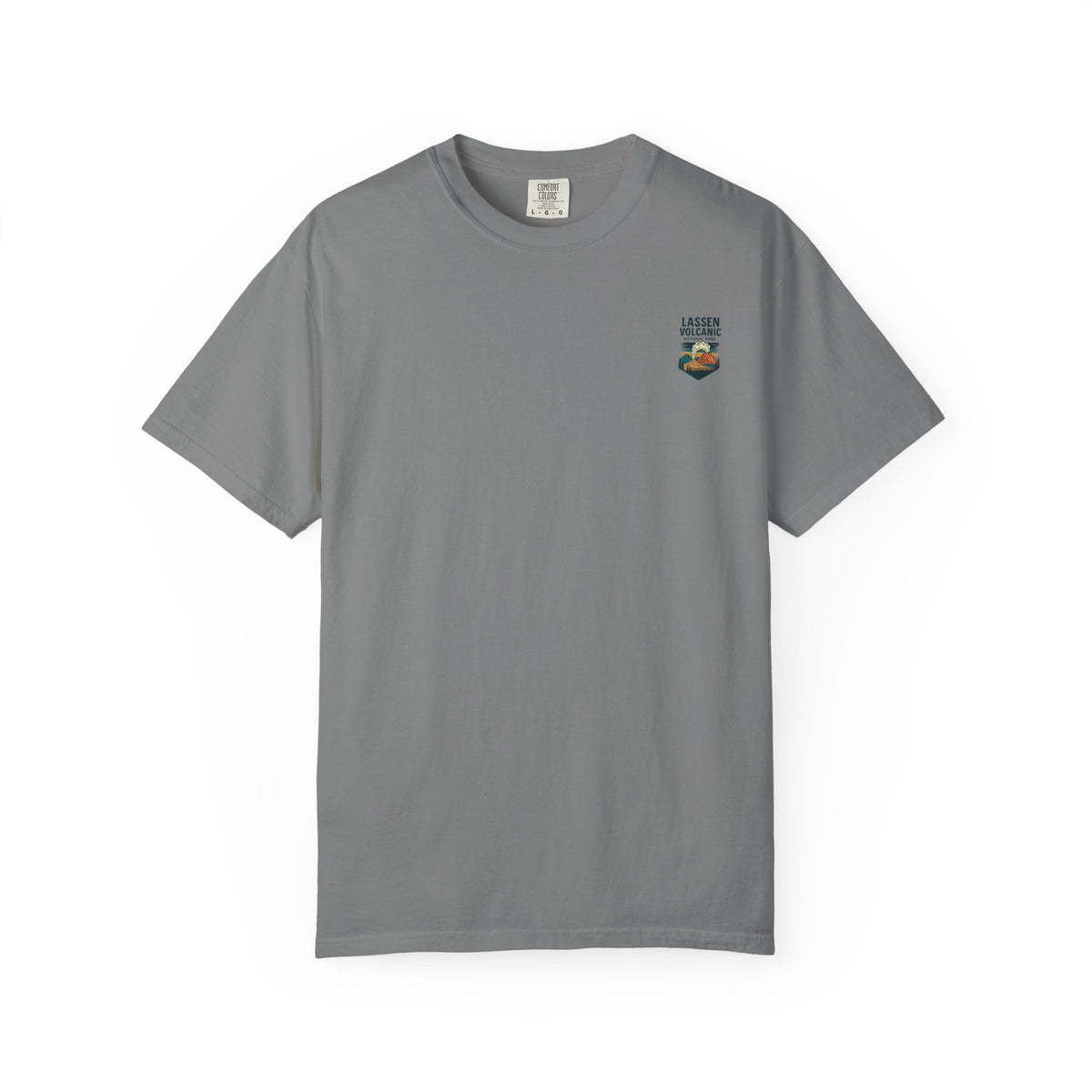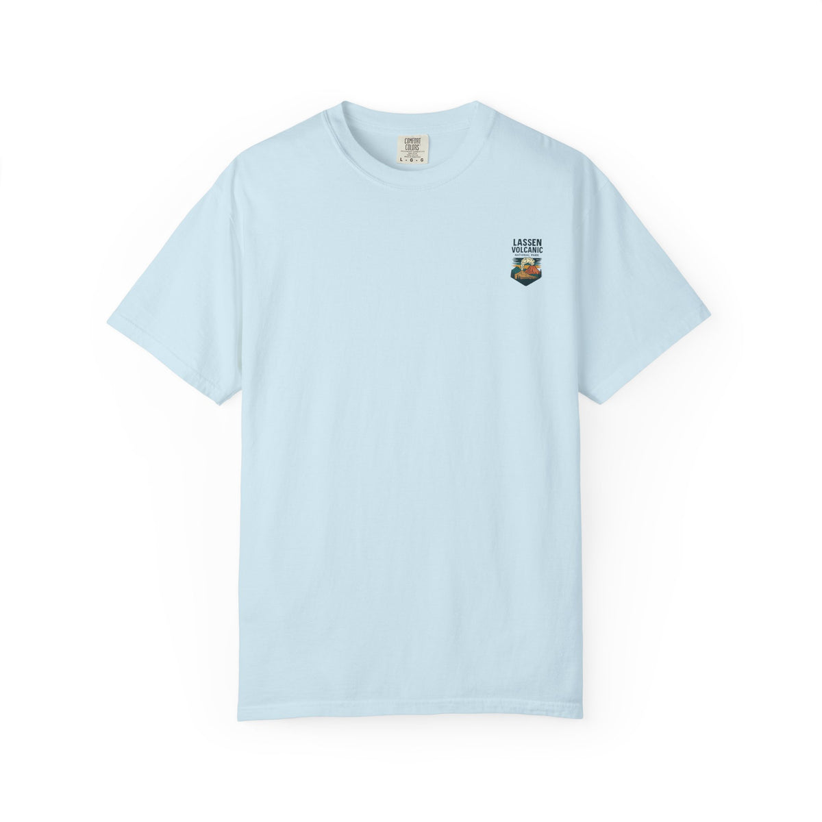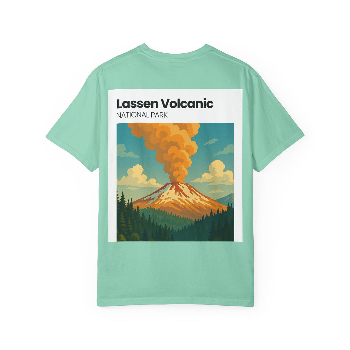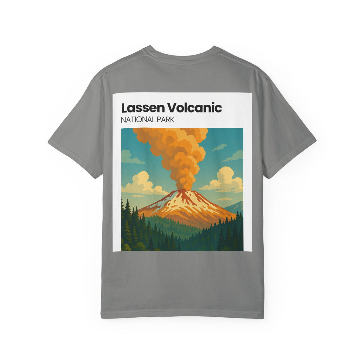 A relaxed, garment-dyed tee that feels lived-in from the first wear. The front carries a small chest emblem while the back showcases a vivid, retro-style illustration of Lassen Volcanic National Park—smoking peak, pine silhouettes, and sunlit clouds rendered in warm, earthy tones. The medium-weight cotton holds the print’s color nicely and the relaxed cut layers easily over a flannel or under a jacket for cool mornings on the trail. Wear it to remind yourself of big skies, smoky ridgelines, and the slow hush of forested campsites.
