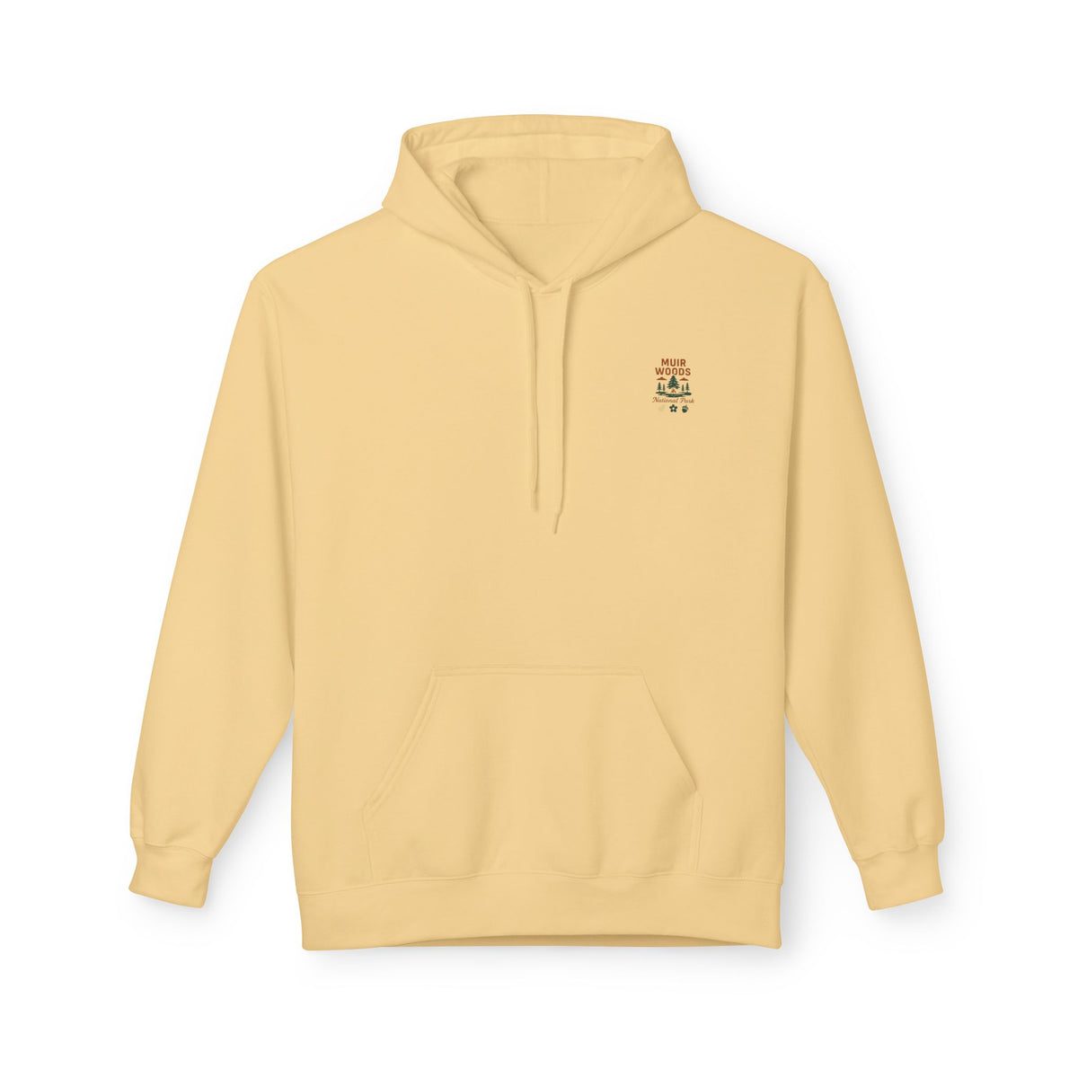 Soft, warm, and quietly adventurous — this midweight fleece hoodie is built for slow mornings and forest walks. The front keeps the design minimal with a small emblem, while the back opens into a deep, painted scene of Muir Woods: towering redwoods, dappled light, and a narrow trail that invites you to step in and breathe. The relaxed drop-shoulder cut and roomy pouch pocket make it easy to layer over a tee or a flannel. Knit in responsibly audited mills and finished with a soft, tear-away label, it feels lived-in from the first wear and ages into a reliable companion for crisp days outdoors and cozy nights at home.