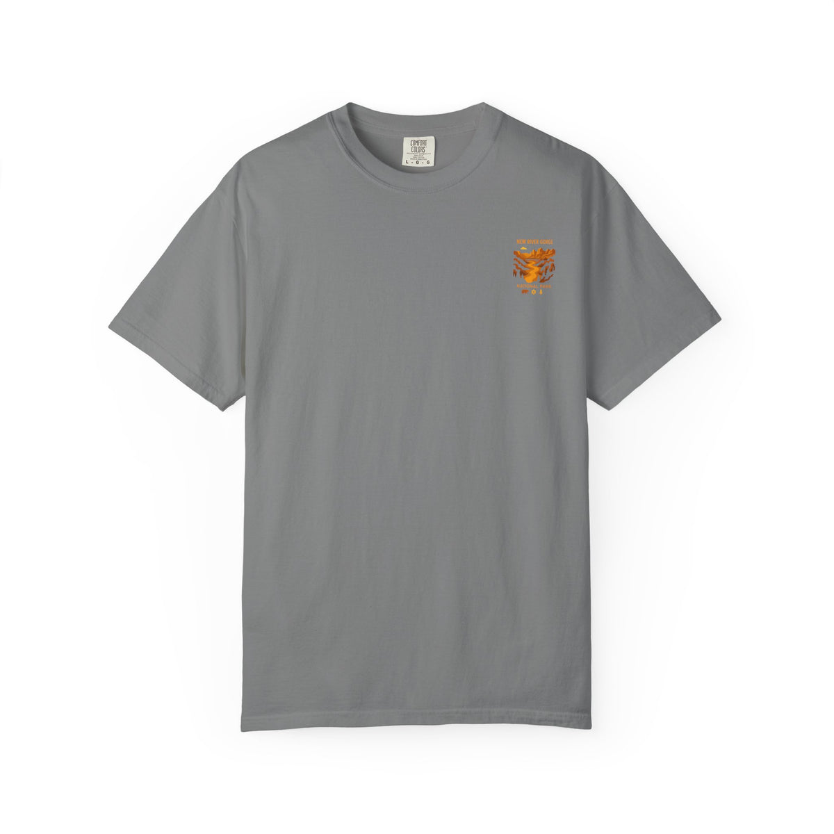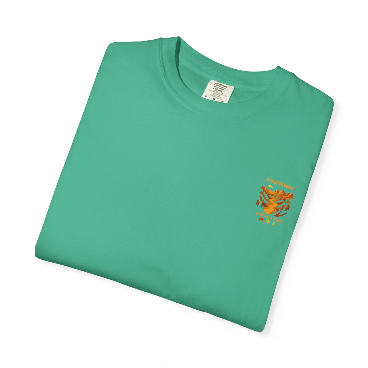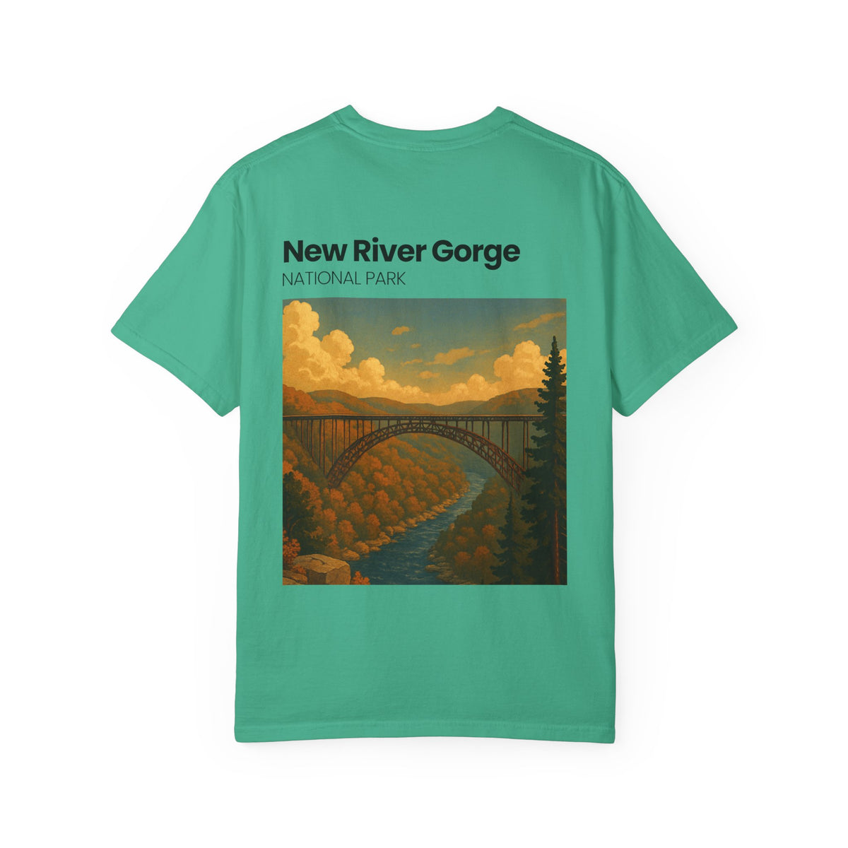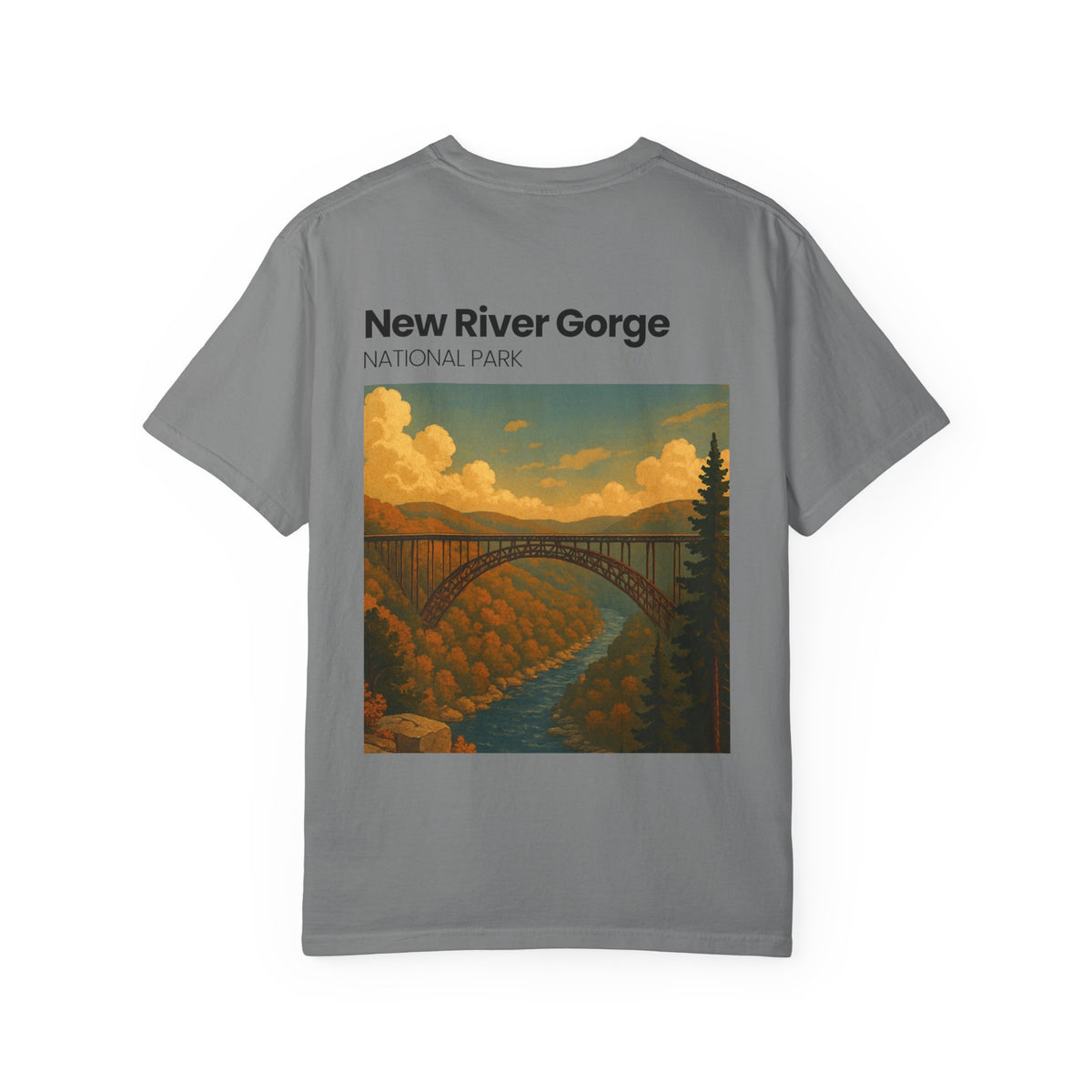 This relaxed-fit garment-dyed tee carries a quiet, nostalgic energy — a soft, worn-in canvas that wears like an old favorite from the very first day. The front keeps things subtle with a small, vintage-style chest emblem, while the back unfolds into a painterly landscape of the New River Gorge: golden hills, a soaring arch bridge, and a ribbon of river cutting through warm autumn light. It’s the kind of shirt you reach for on slow road trips, riverside walks, or evenings around a camp stove. The medium-weight, 100% ring-spun cotton and garment-dyed finish give it a lived-in hand and muted color depth that complements outdoorsy layers. Thoughtful construction — tubular knit, double-needle seams, and a sewn-in label — means it holds up to repeated wear and becomes more comfortable over time.