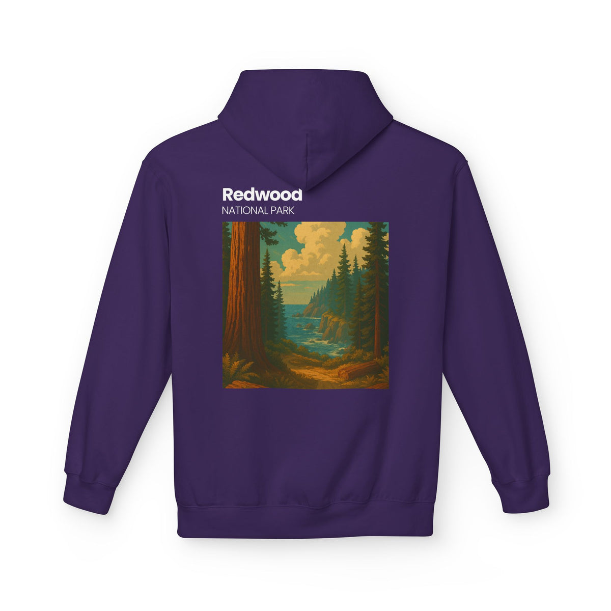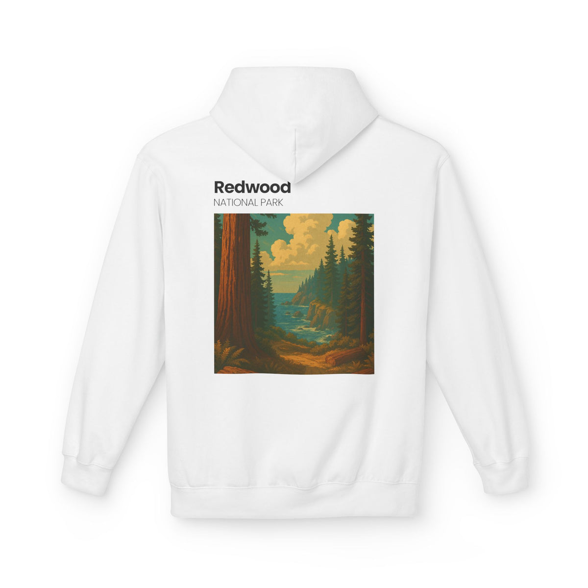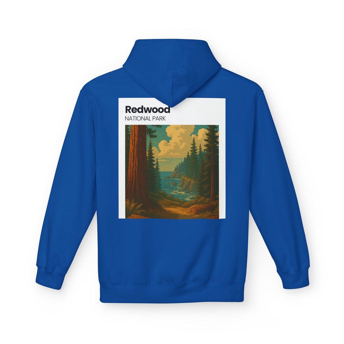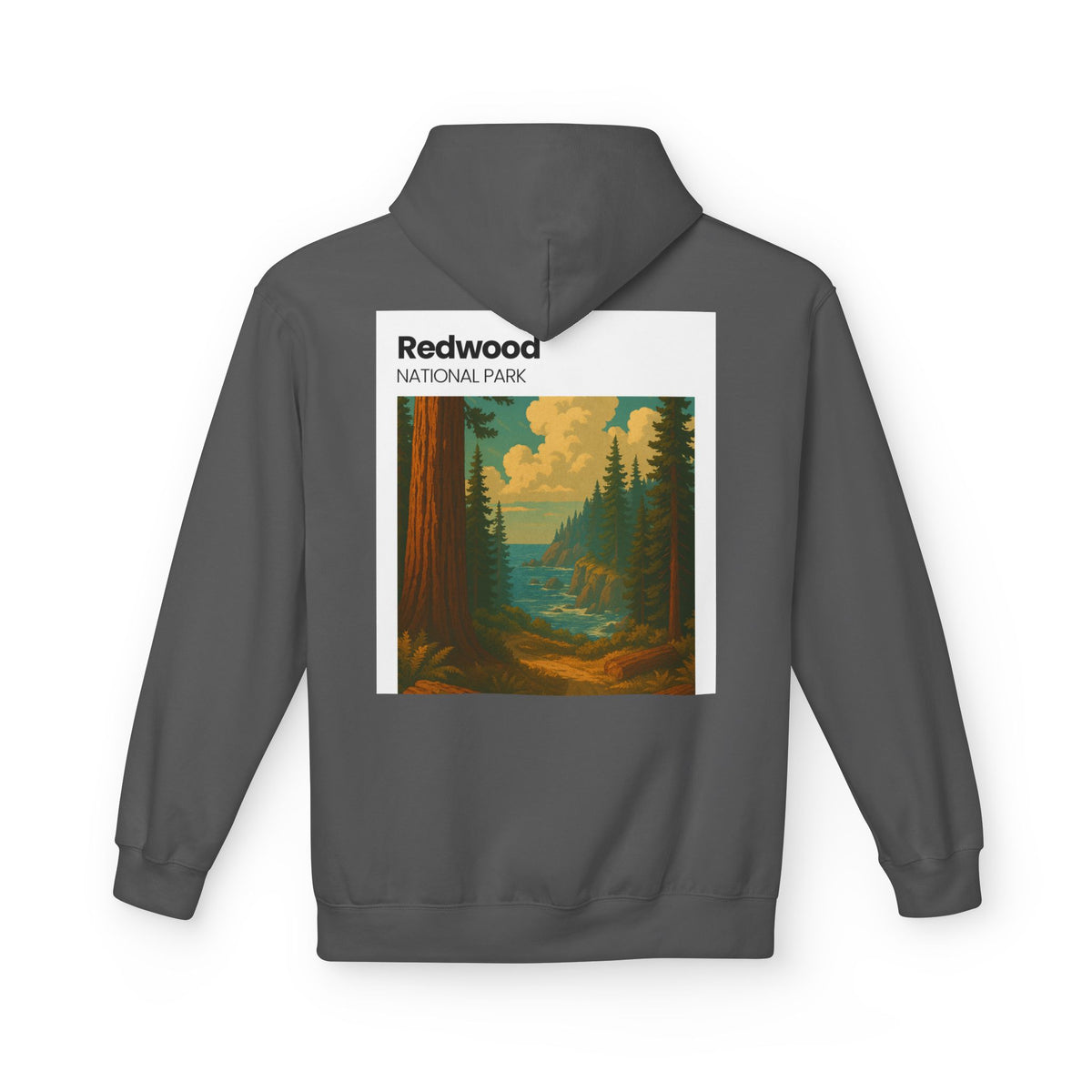 Soft, warm, and quietly bold — this midweight fleece hoodie brings a pocket of the forest into everyday wear. The front bears a small, understated emblem while the back opens into a vintage-style Redwood National Park scene: towering trunks, sunlit glades, and a river threading through the trees. It drapes with relaxed shoulders and a roomy pouch pocket that invites hands, maps, or a travel mug. Built with a soft cotton face and sturdy knit interior, the hoodie holds its shape while feeling lived-in. Thoughtfully made in OEKO-TEX and socially conscious facilities, it’s for people who want gear that speaks to their outdoor-loving values without shouting.