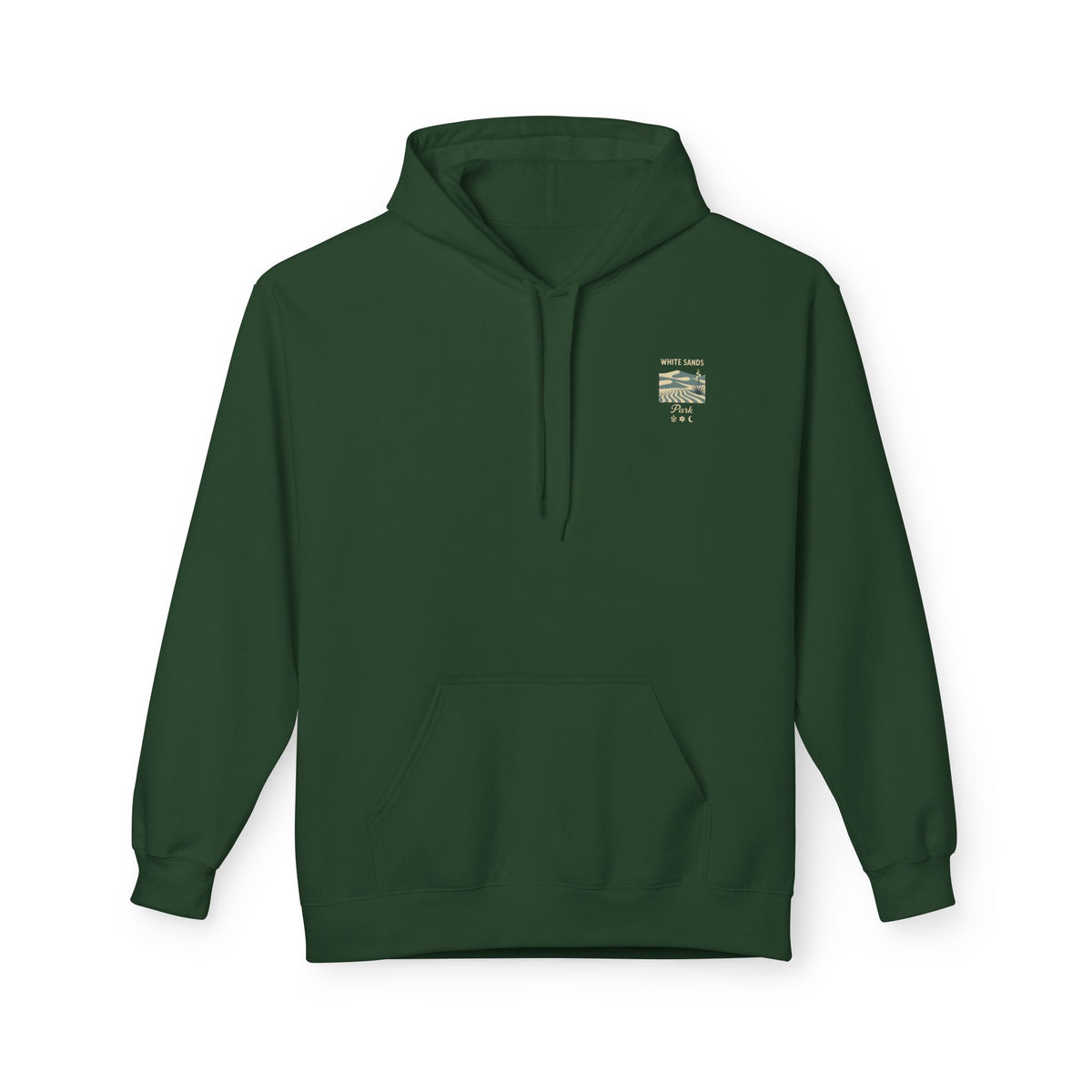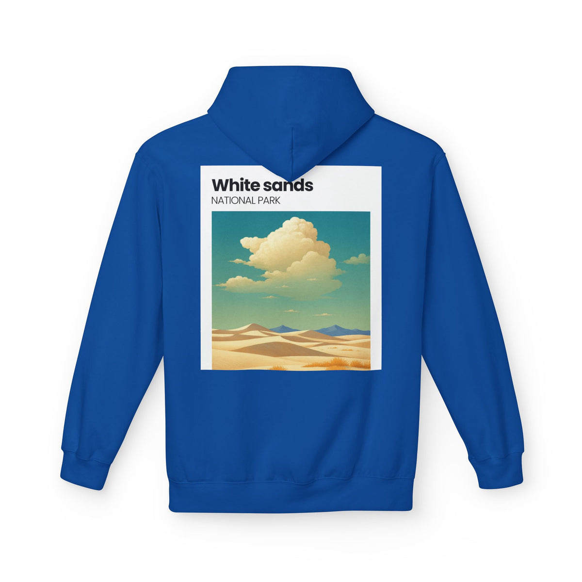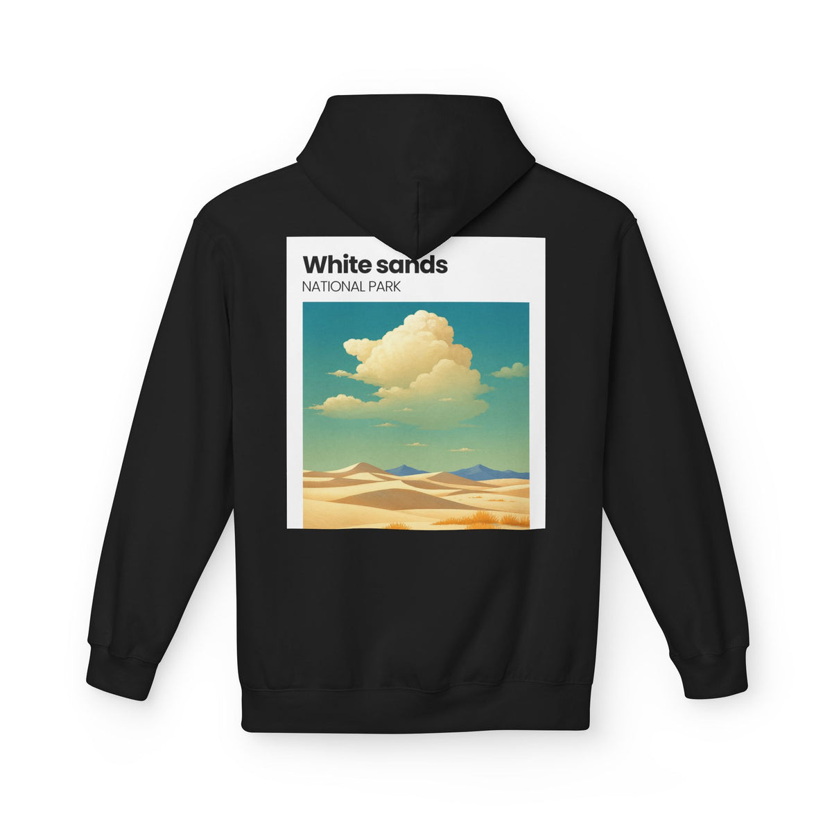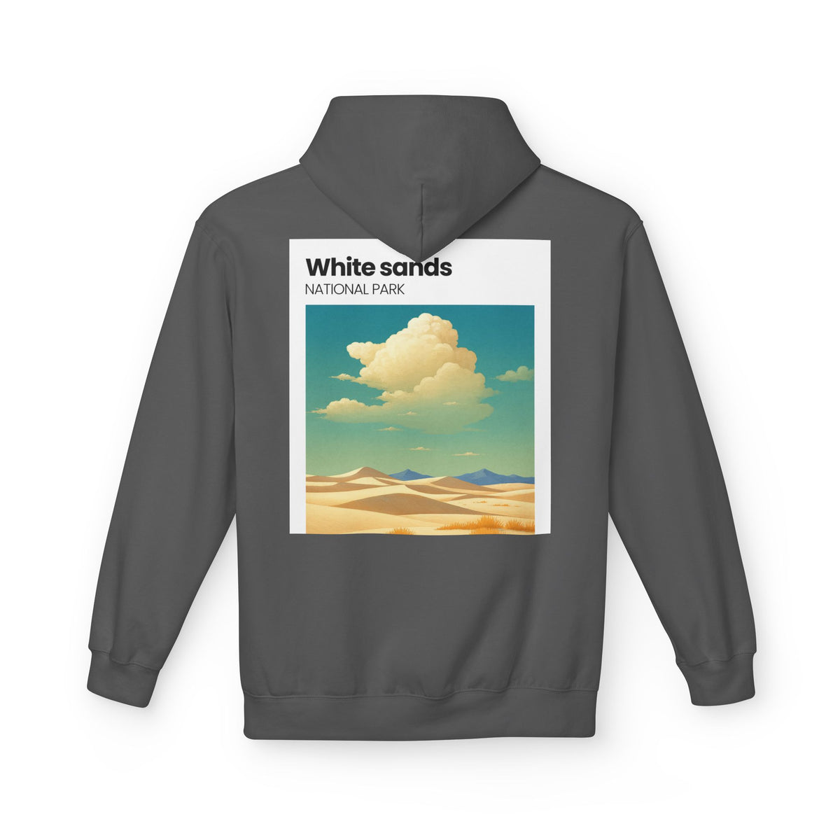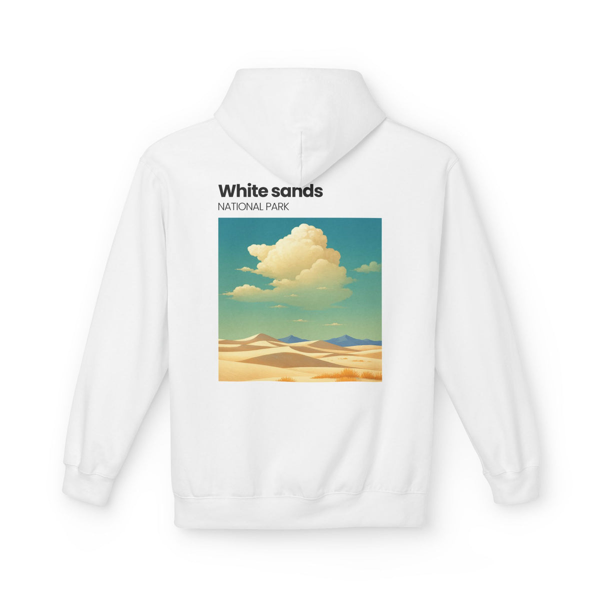 A soft, midweight hoodie inspired by wide-open desert light and vintage park posters. The front wears a small, embroidered-style patch near the chest while the back carries a sun-washed illustration of dunes and drifting clouds labeled “White sands NATIONAL PARK.” It sits comfortably over layers with dropped shoulders and a roomy pouch pocket for hands or essentials. The brushed interior and two-piece lined hood feel warm without bulk — the kind of hoodie you reach for on chilly morning drives, slow hikes across sandy ridges, or evenings around a fire. Thoughtful manufacturing details — OEKO-TEX certification and FLA/WRAP partnerships — mean you’re choosing something made with environmental and labor considerations in mind.