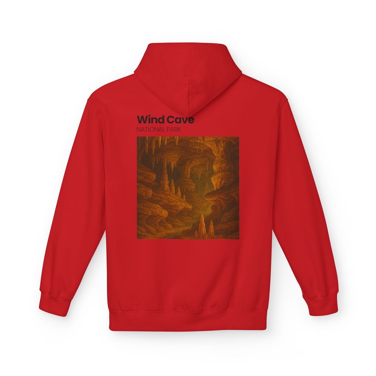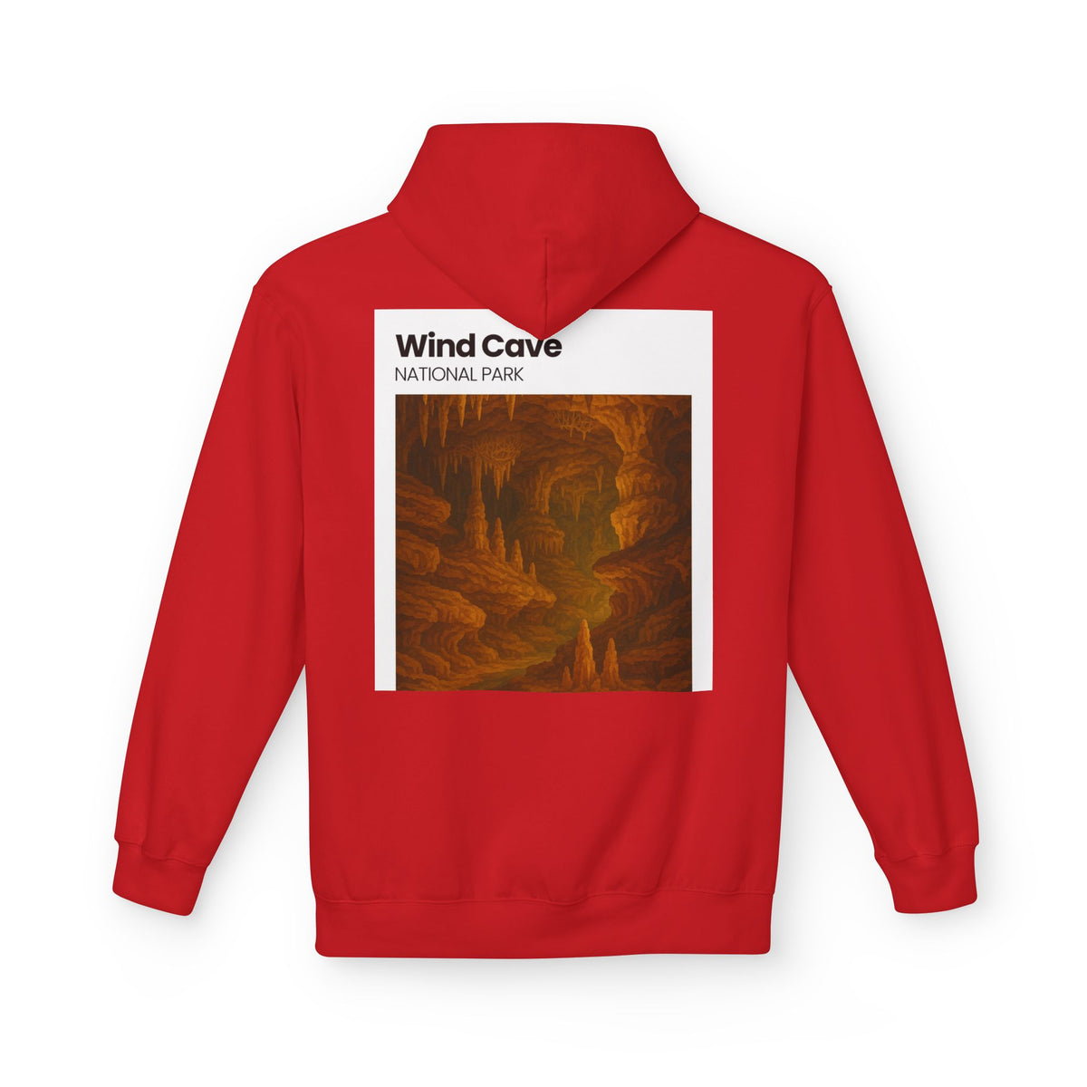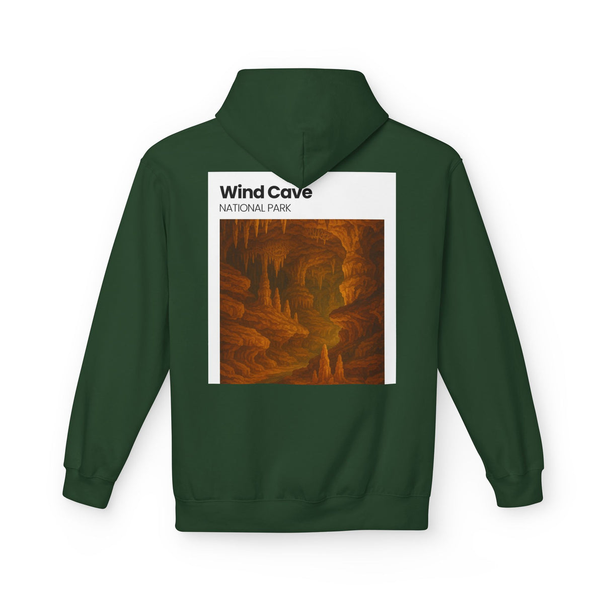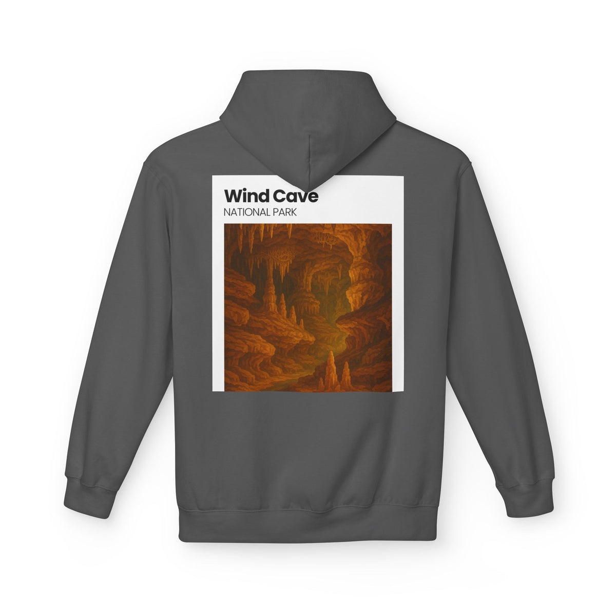 A laid-back midweight hoodie that feels like a quiet evening spent exploring an underground world. Soft, brushed fleece hugs you while the two-piece lined hood and roomy pouch pocket keep hands warm after long walks or late-night stargazing. The back features a warm, painterly cave scene with “Wind Cave National Park” text—subtle nostalgia for trips into hidden places. The classic fit and dropped shoulders give a relaxed, lived-in silhouette that layers easily over tees or base layers. Socially conscious and sustainably made, it’s built to travel with you from trailhead to campground and back again.